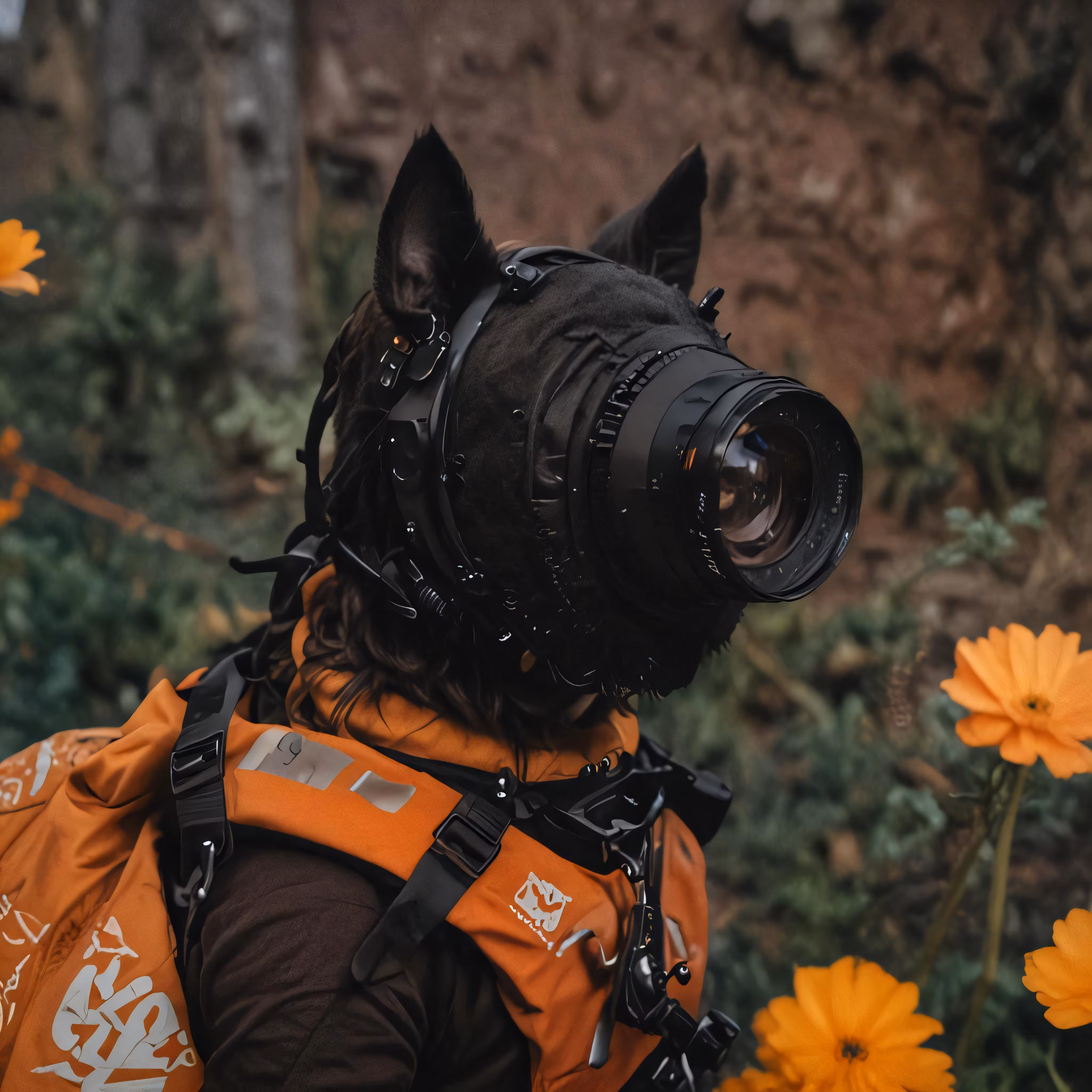 High resolution picture, free to use, a dog has an orange backpack and there are flowers behind him