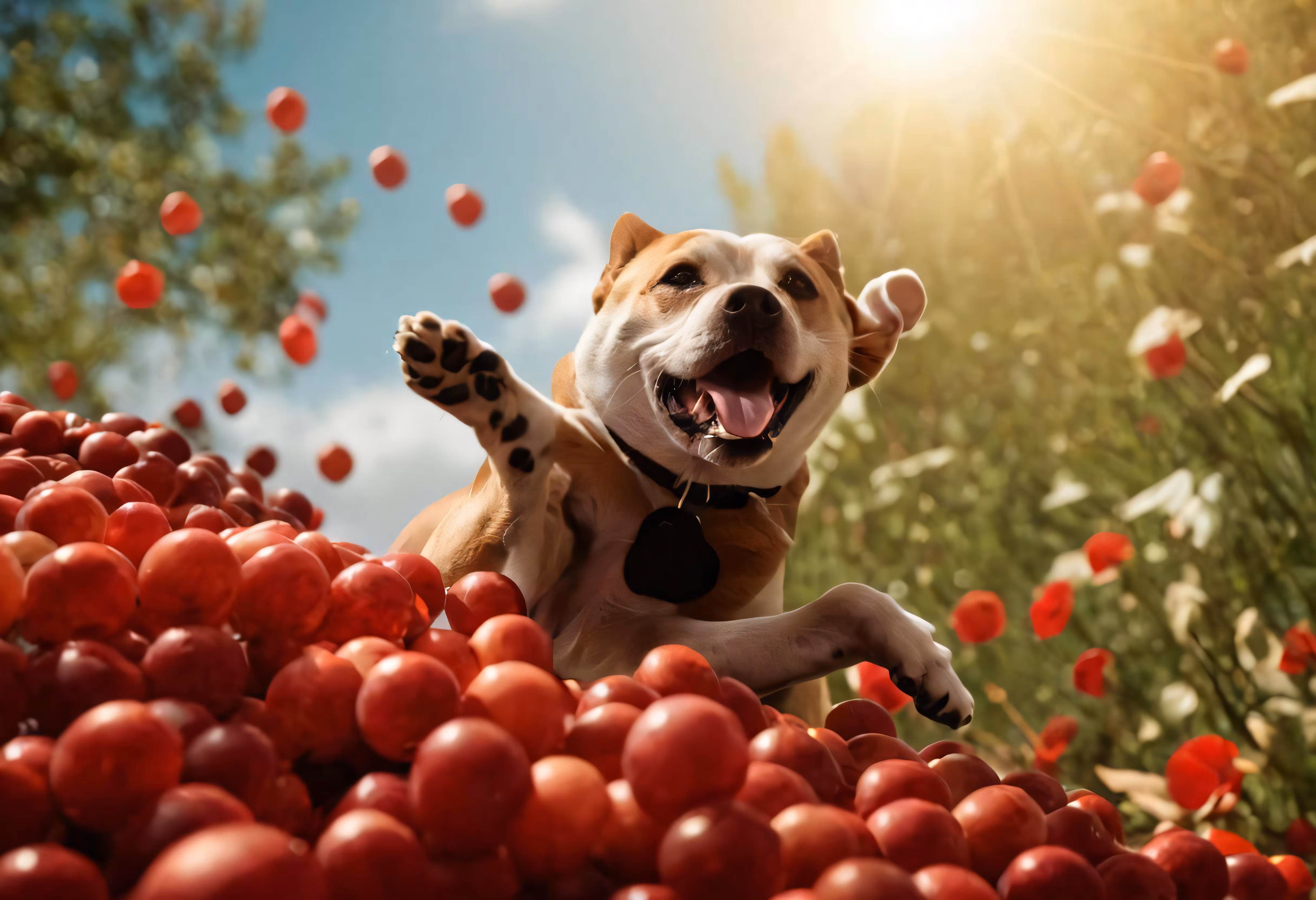 High resolution picture, free to use, a dog is smiling with his paw up in a bunch of cherries