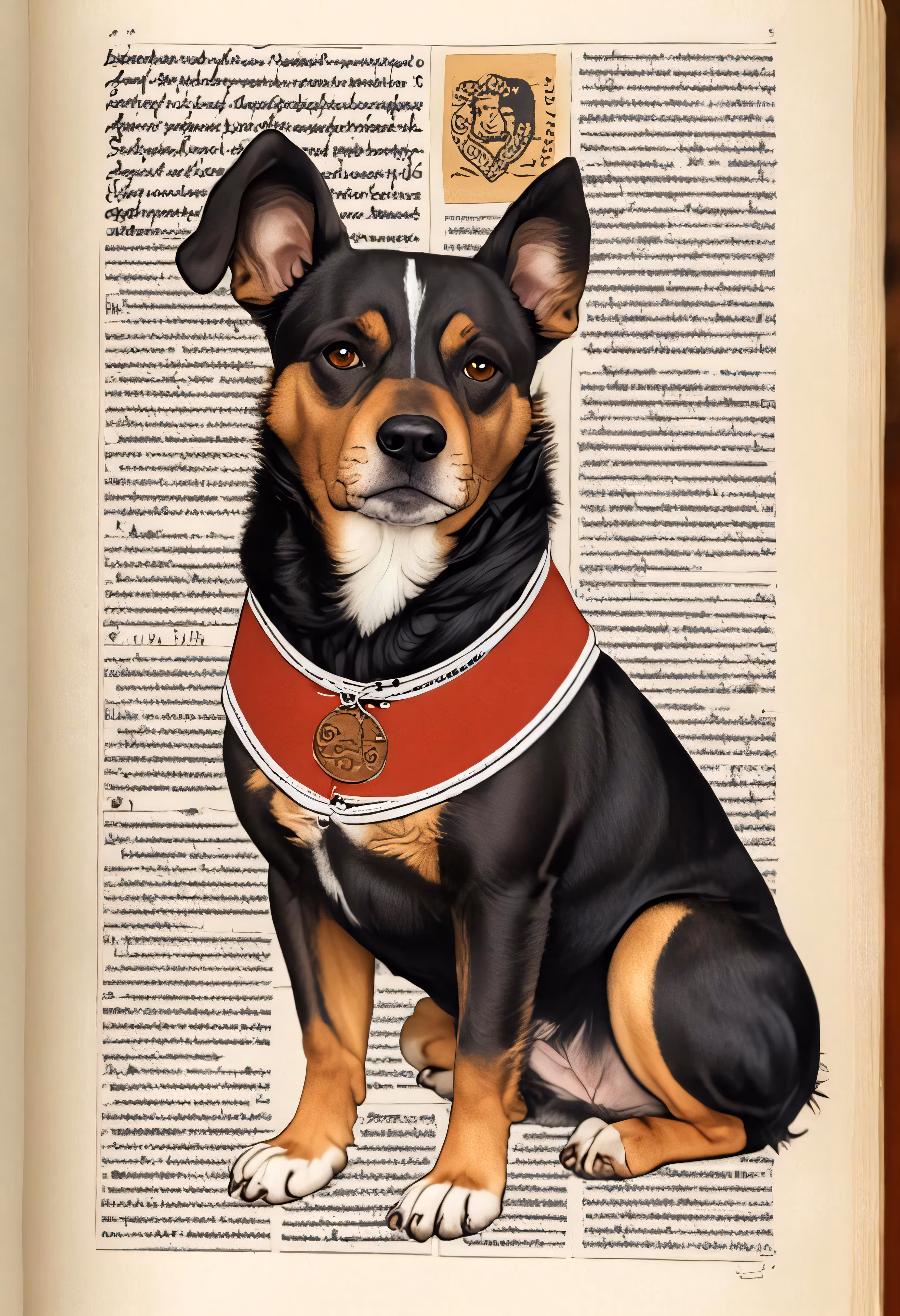 High resolution picture, free to use, a dog sitting on top of an old dictionary