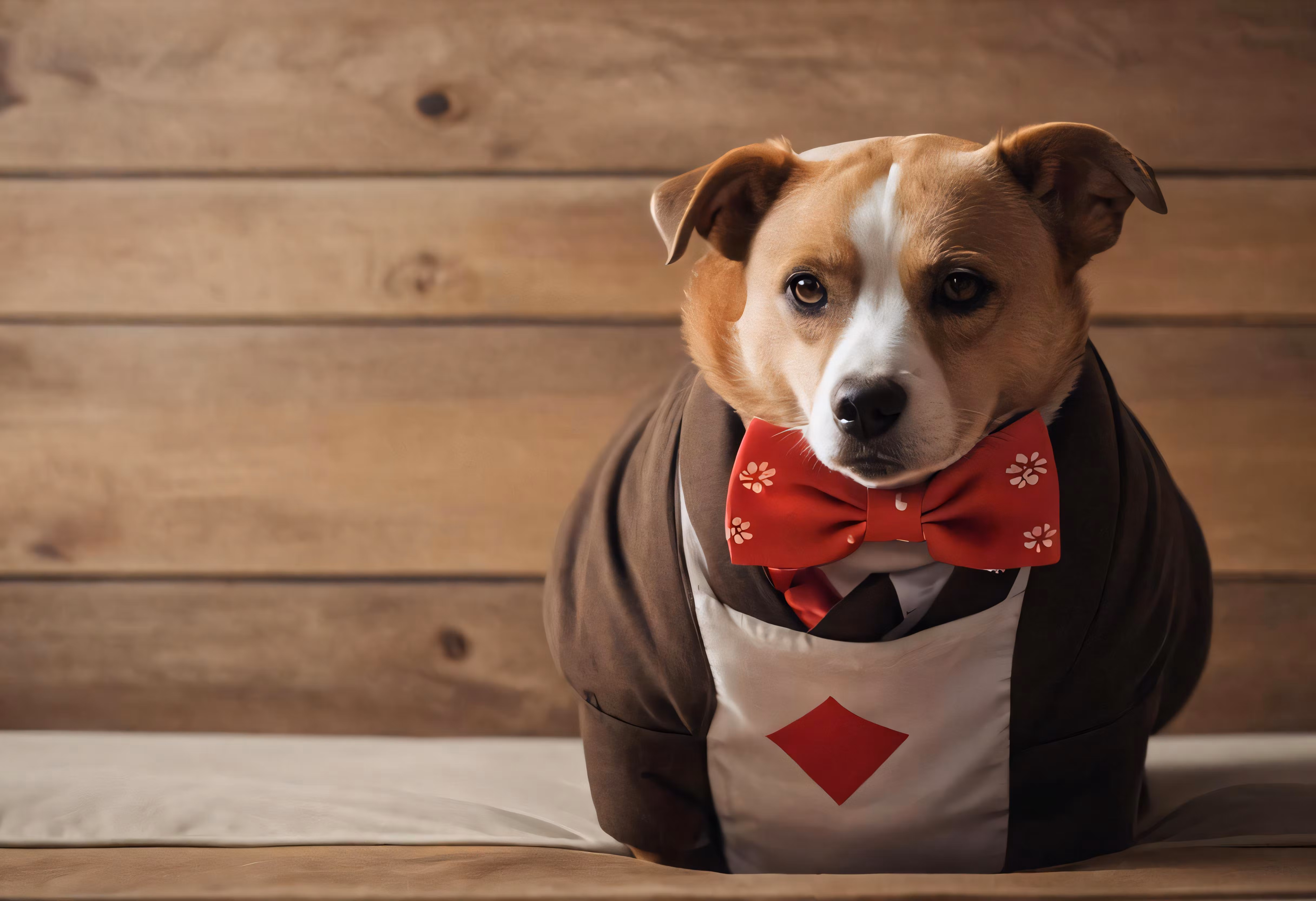 High resolution picture, free to use, a dog wearing an argyle vest and red bow tie
