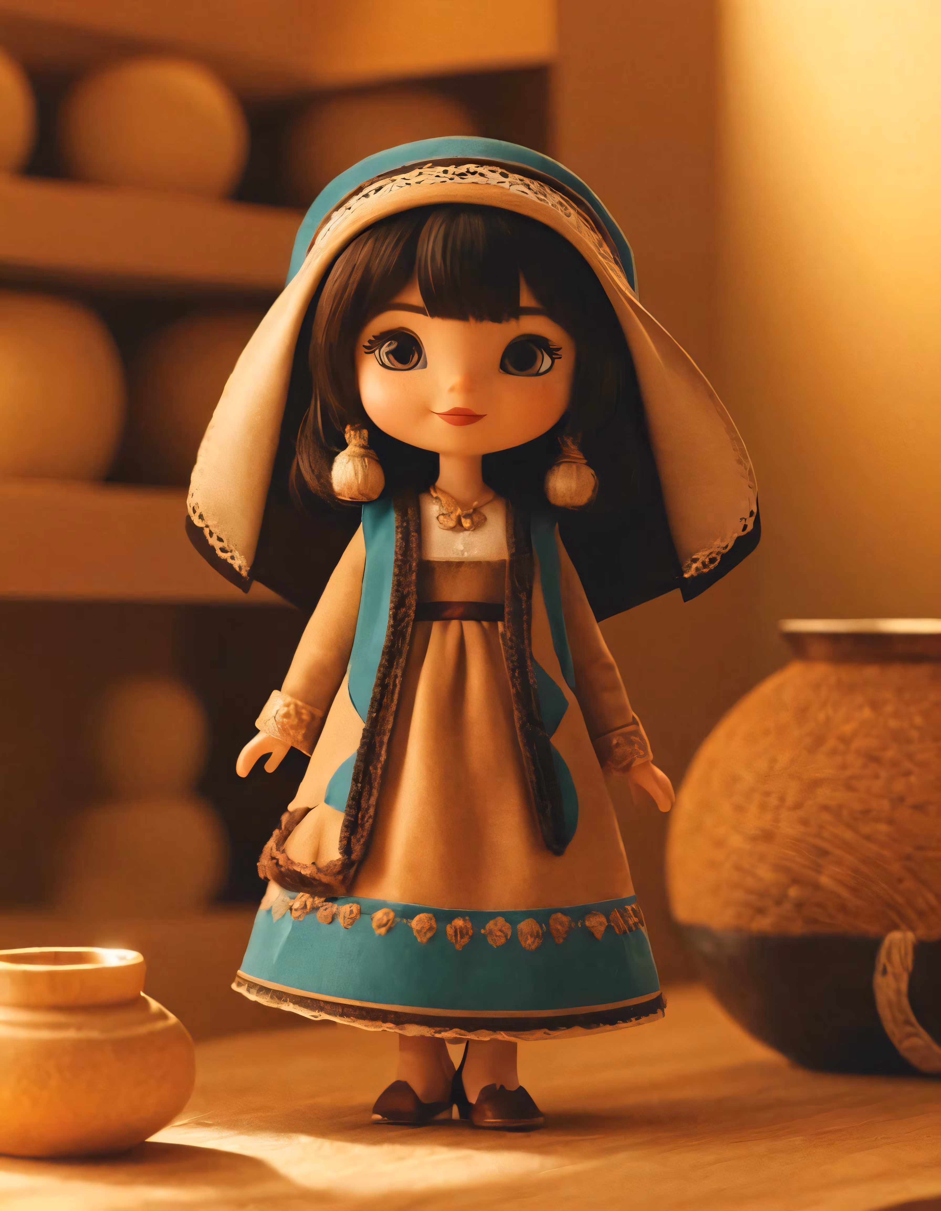 High resolution picture, free to use, a doll in a hat and dress is standing on a table