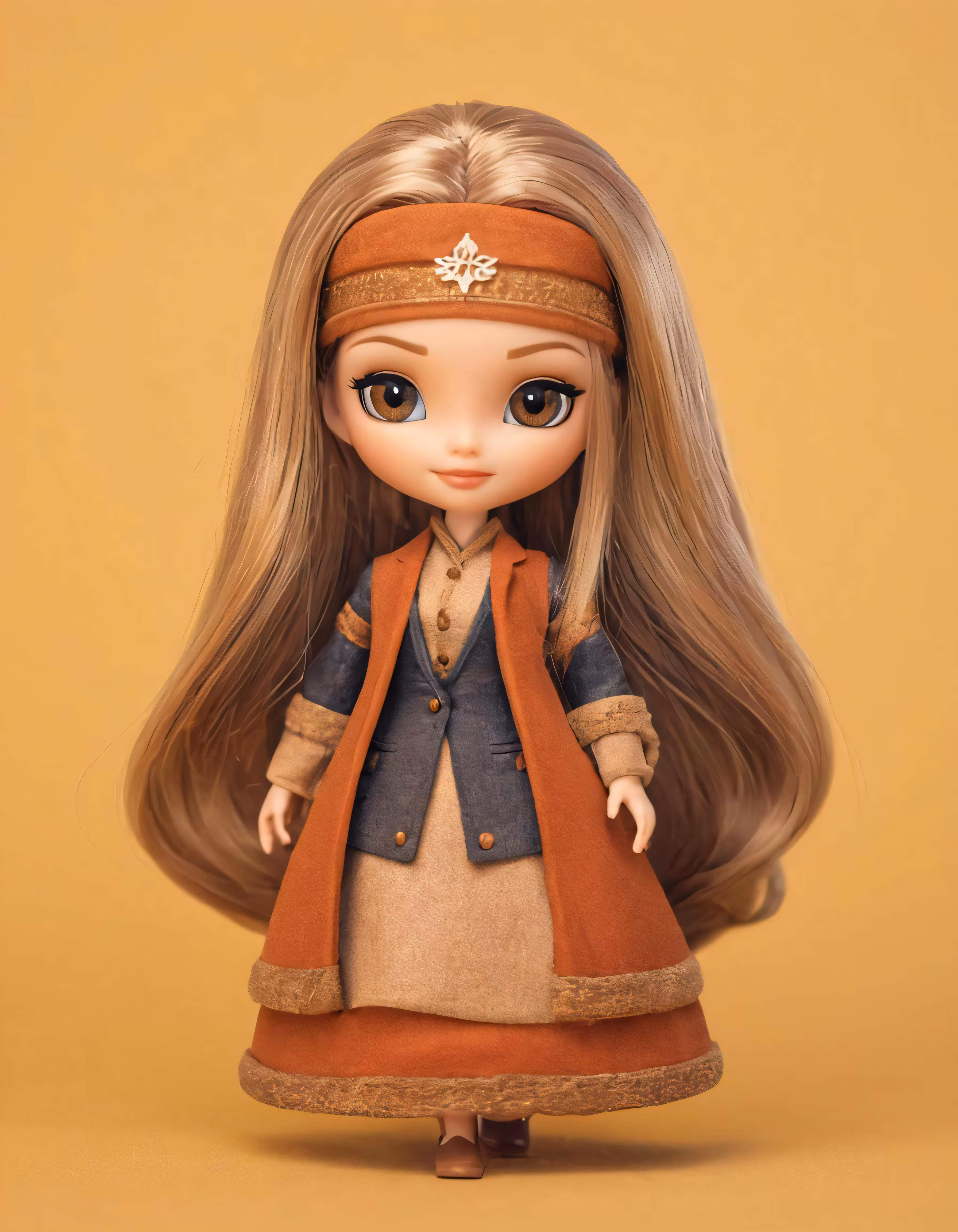 High resolution picture, free to use, a doll wearing a brown dress and long blond hair