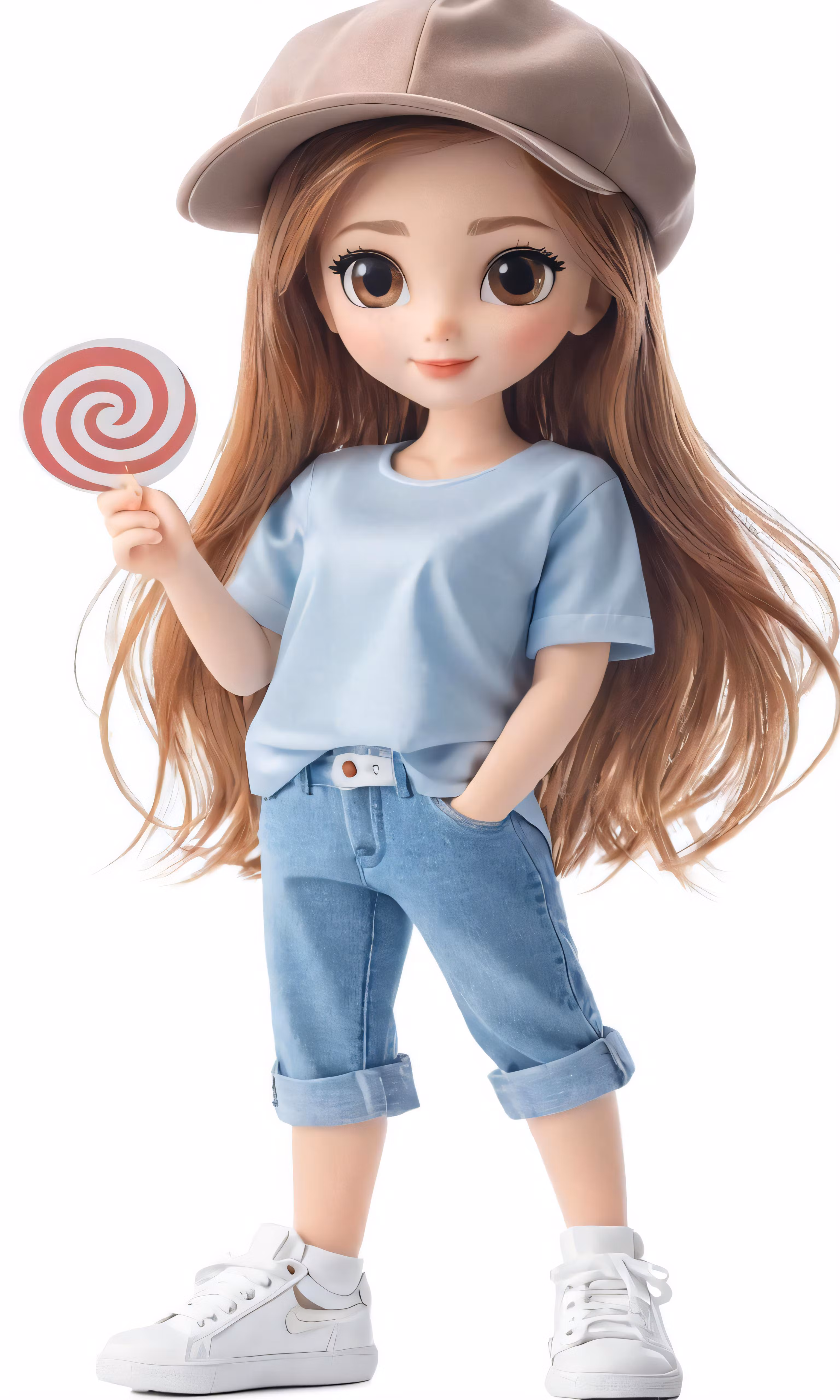 High resolution picture, free to use, a doll with long hair and glasses holding a lollipop