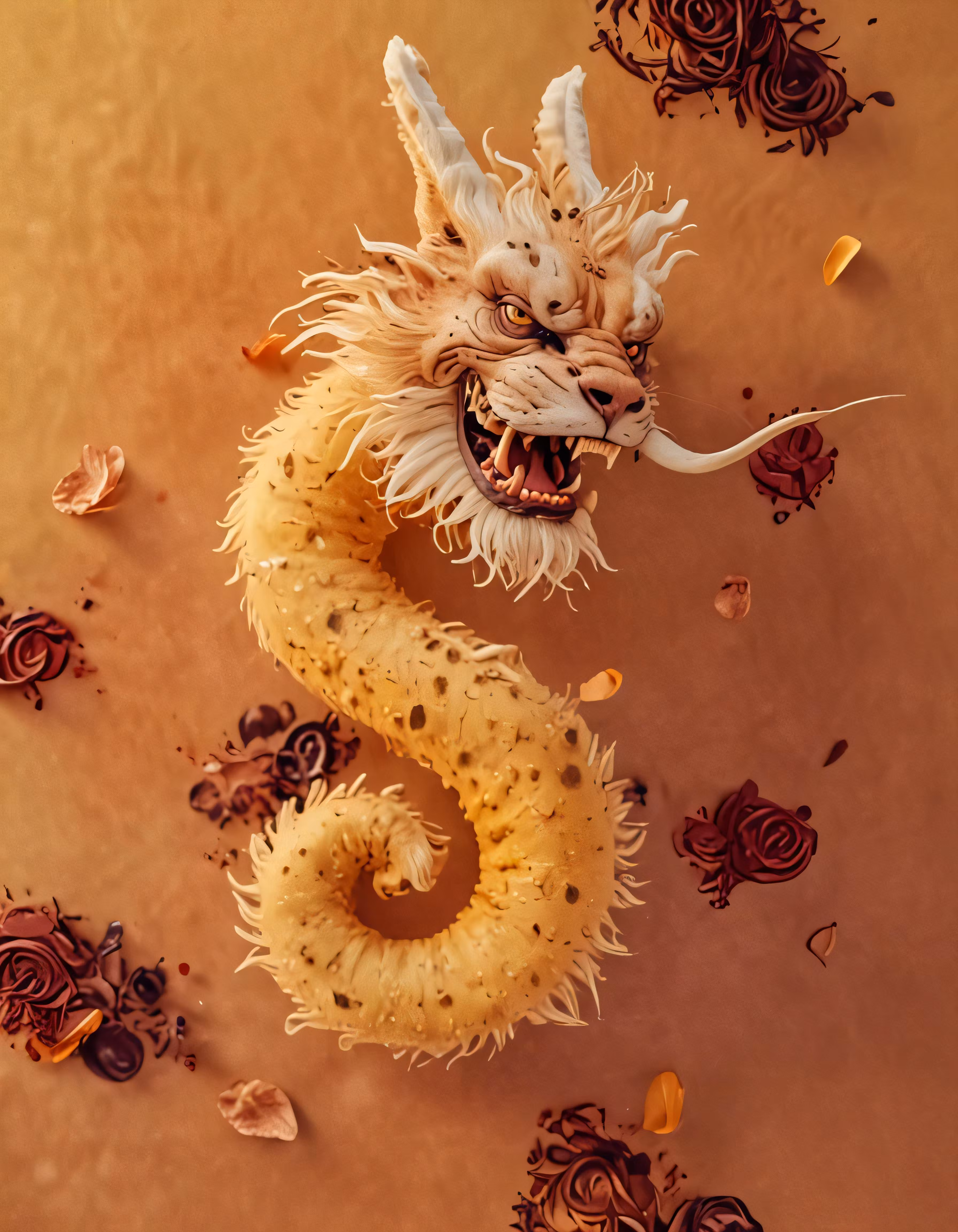 High resolution picture, free to use, a dragon figurine made of chocolate candy is lying on the ground