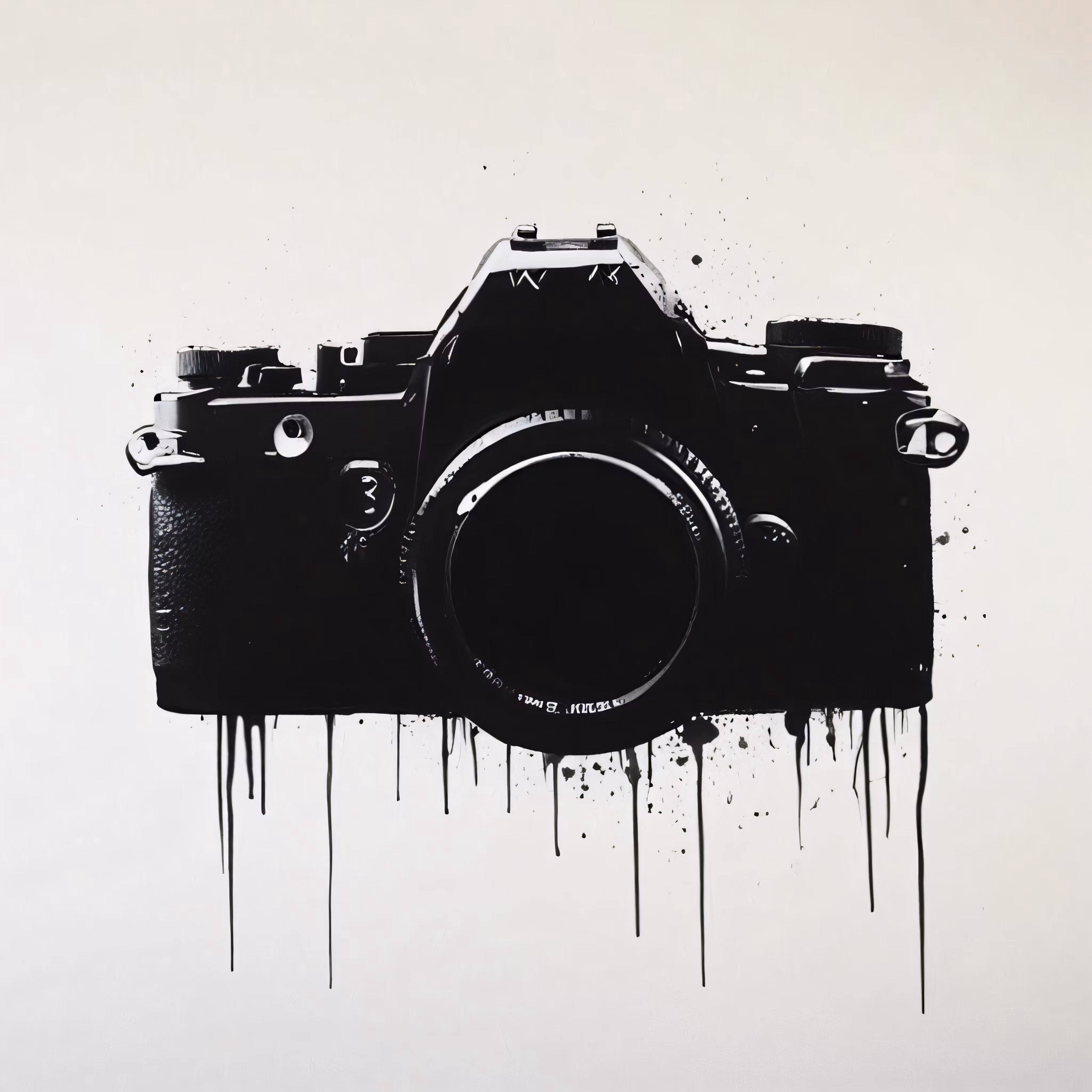 High resolution picture, free to use, a drawing of a camera painted black in ink