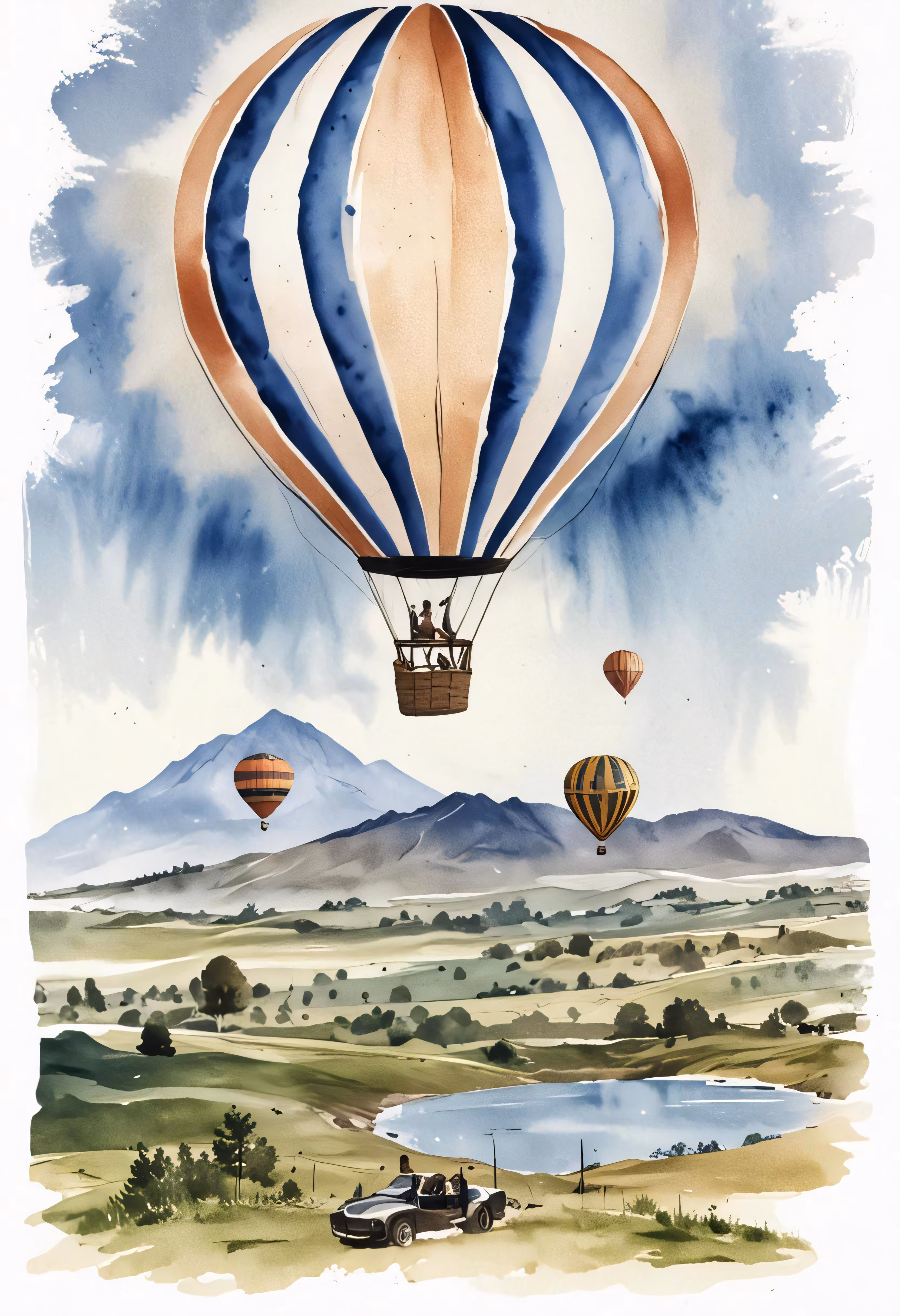 High resolution picture, free to use, a drawing of a hot air balloon with several people inside of it