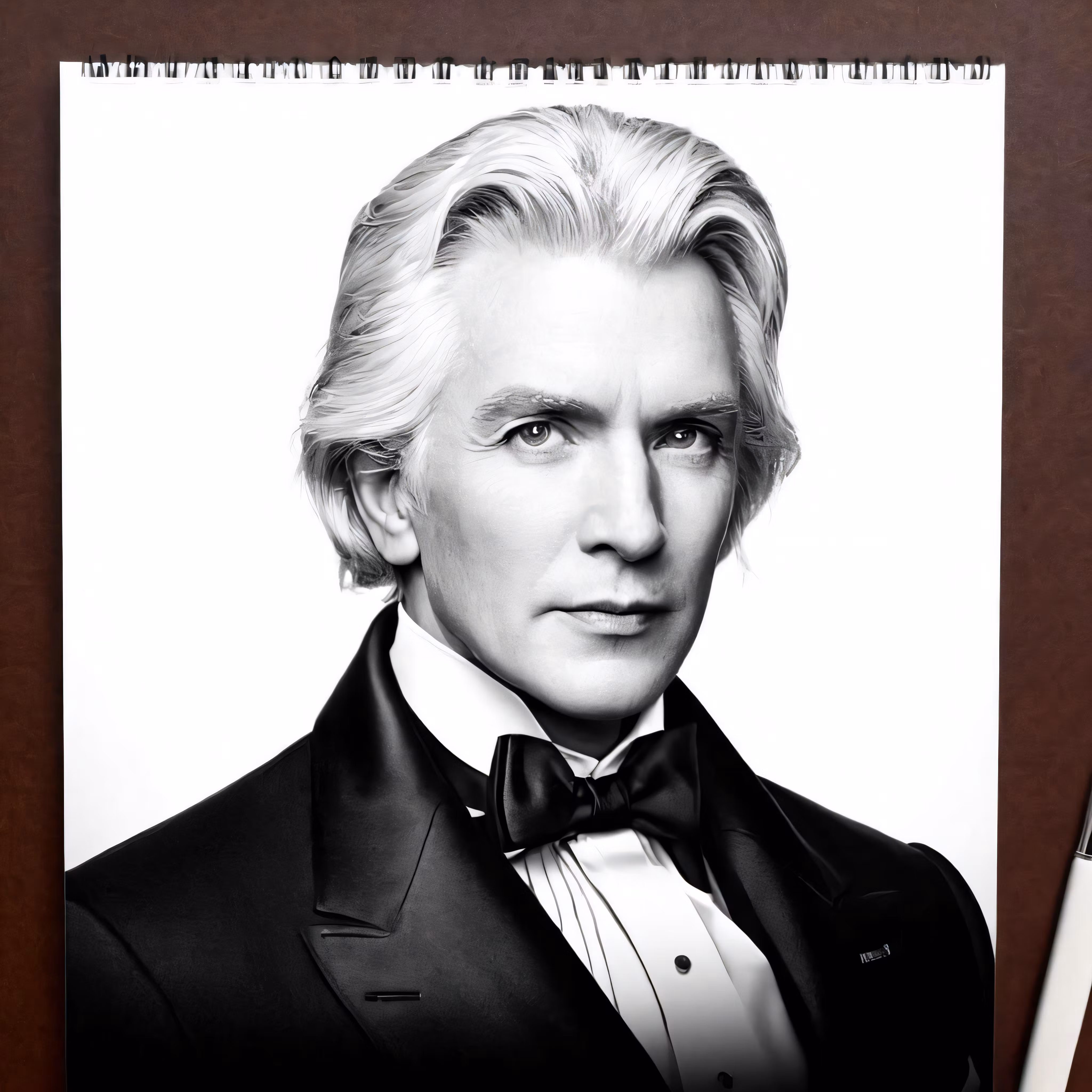High resolution picture, free to use, a drawing of a man in a tuxedo and bow tie with a pen next to him