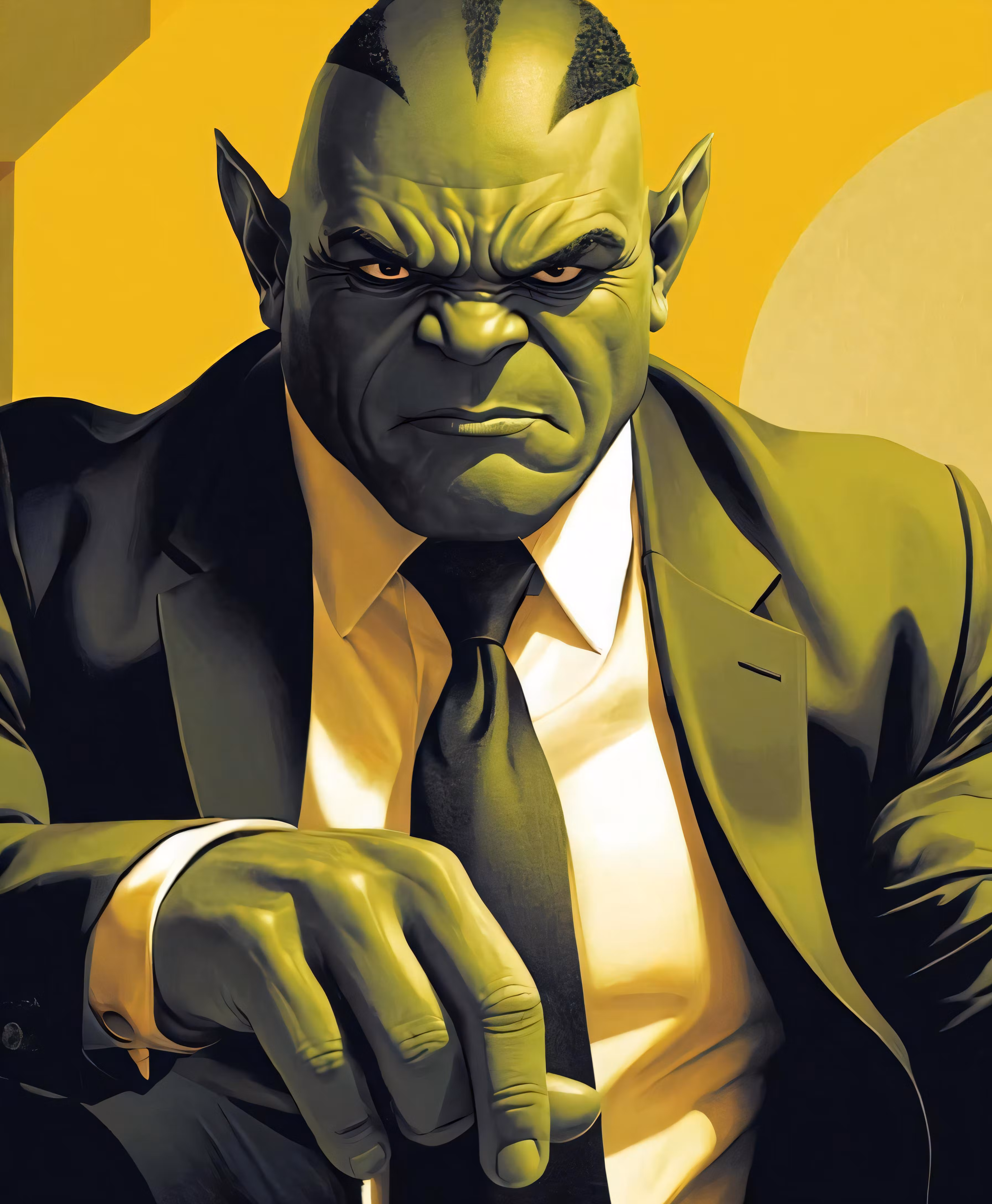 High resolution picture, free to use, a drawing of a man wearing a green suit, pointing at something