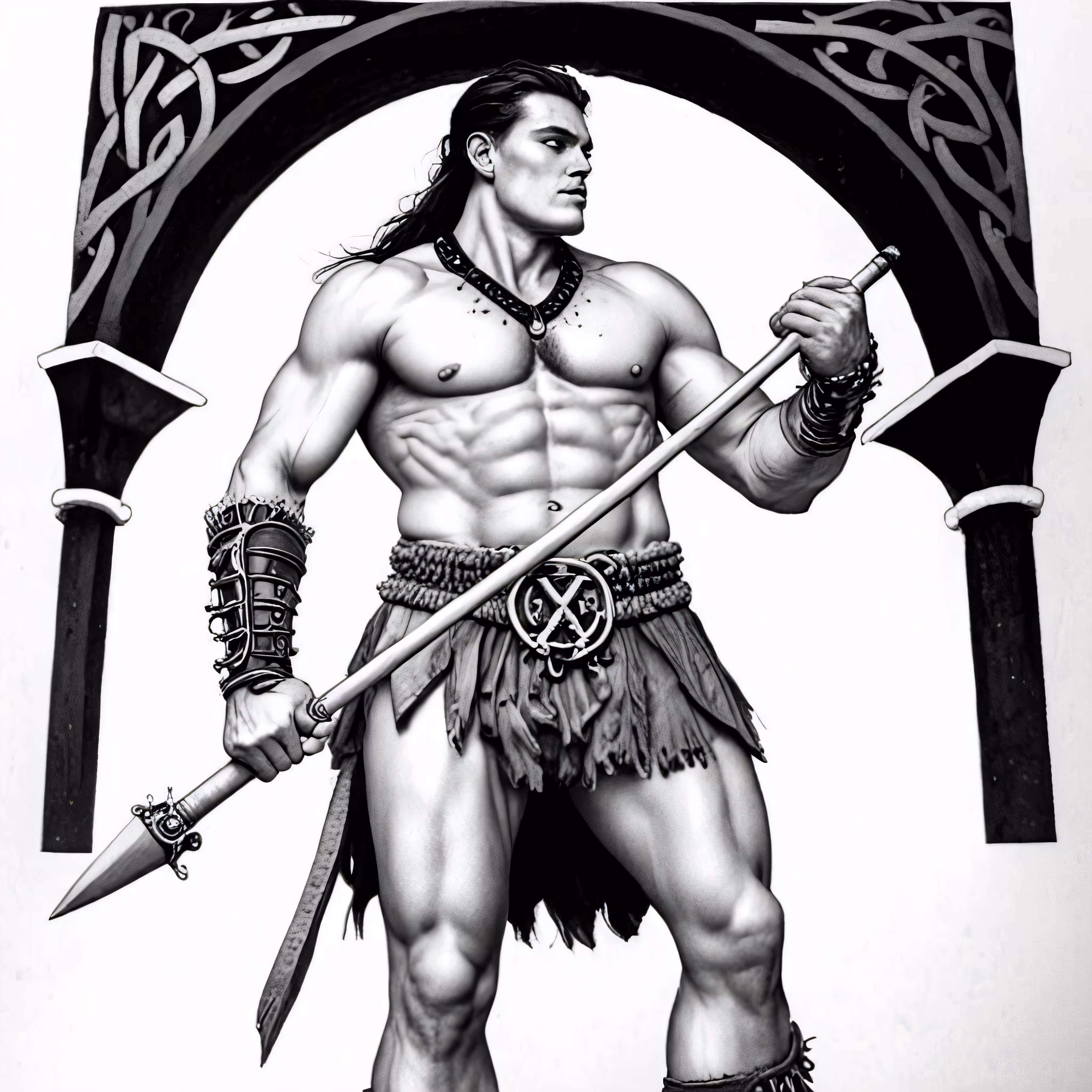 High resolution picture, free to use, a drawing of a native man with axes and an axe