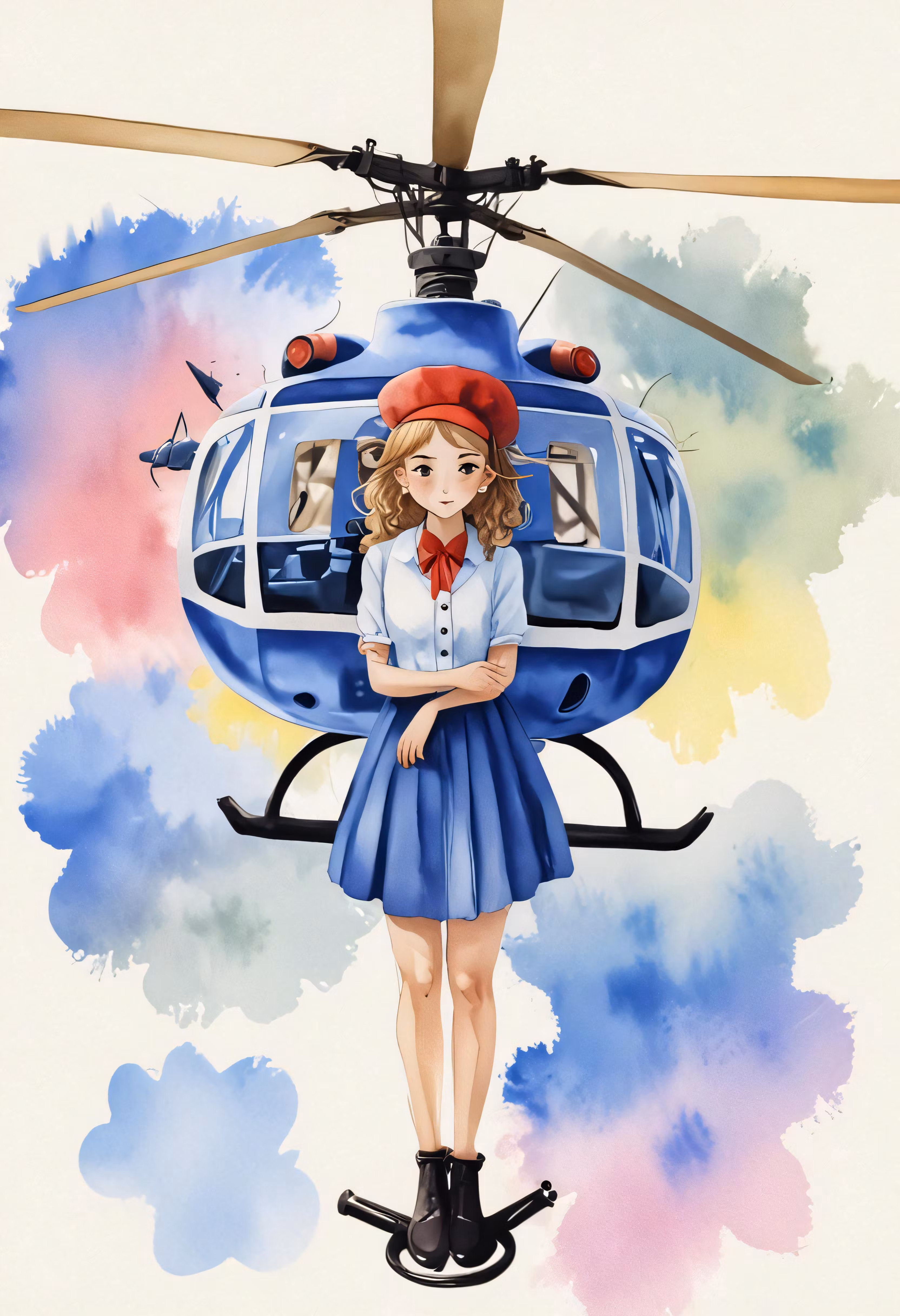 High resolution picture, free to use, a drawing of a person standing next to a helicopter