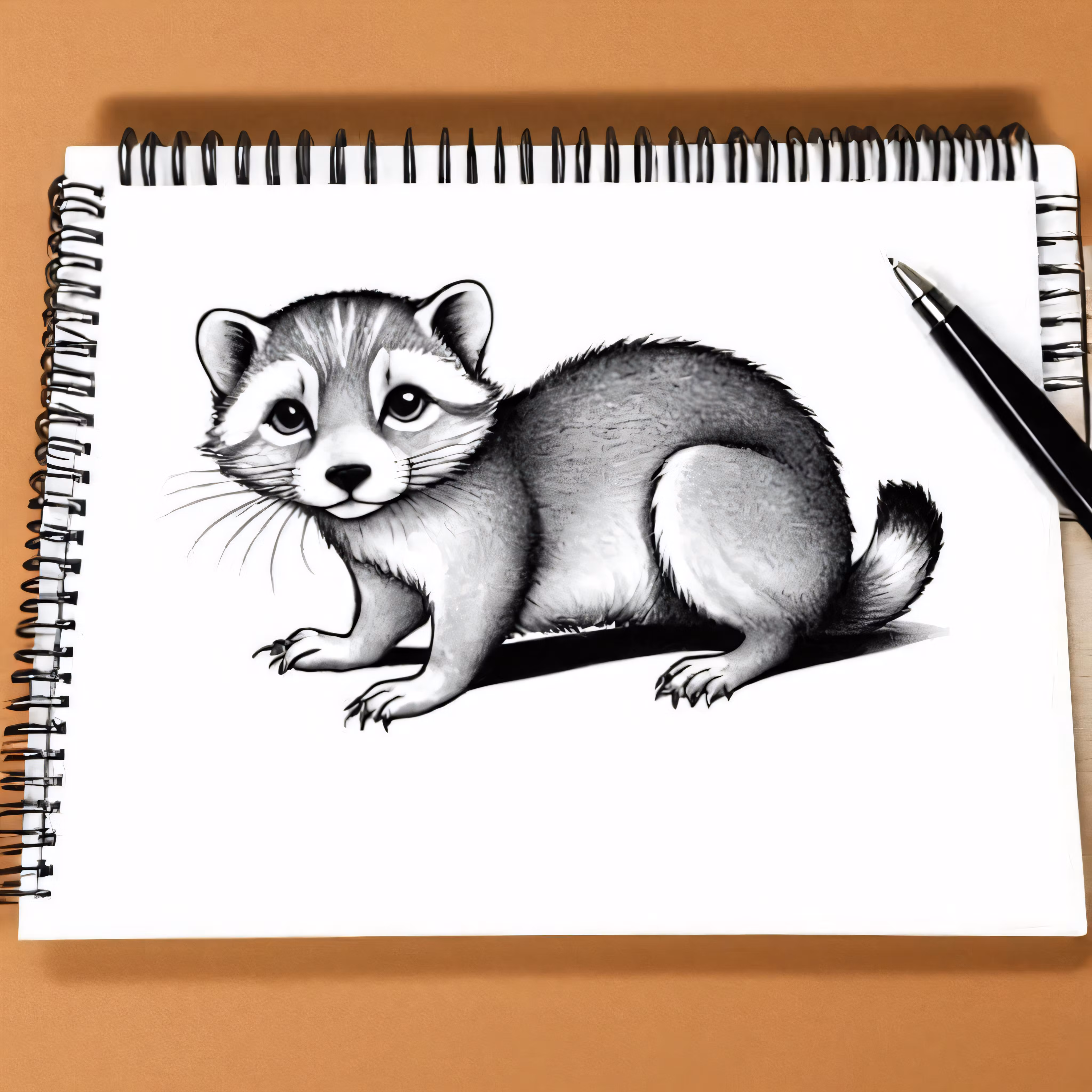 High resolution picture, free to use, a drawing of a racoon on a paper next to a pen