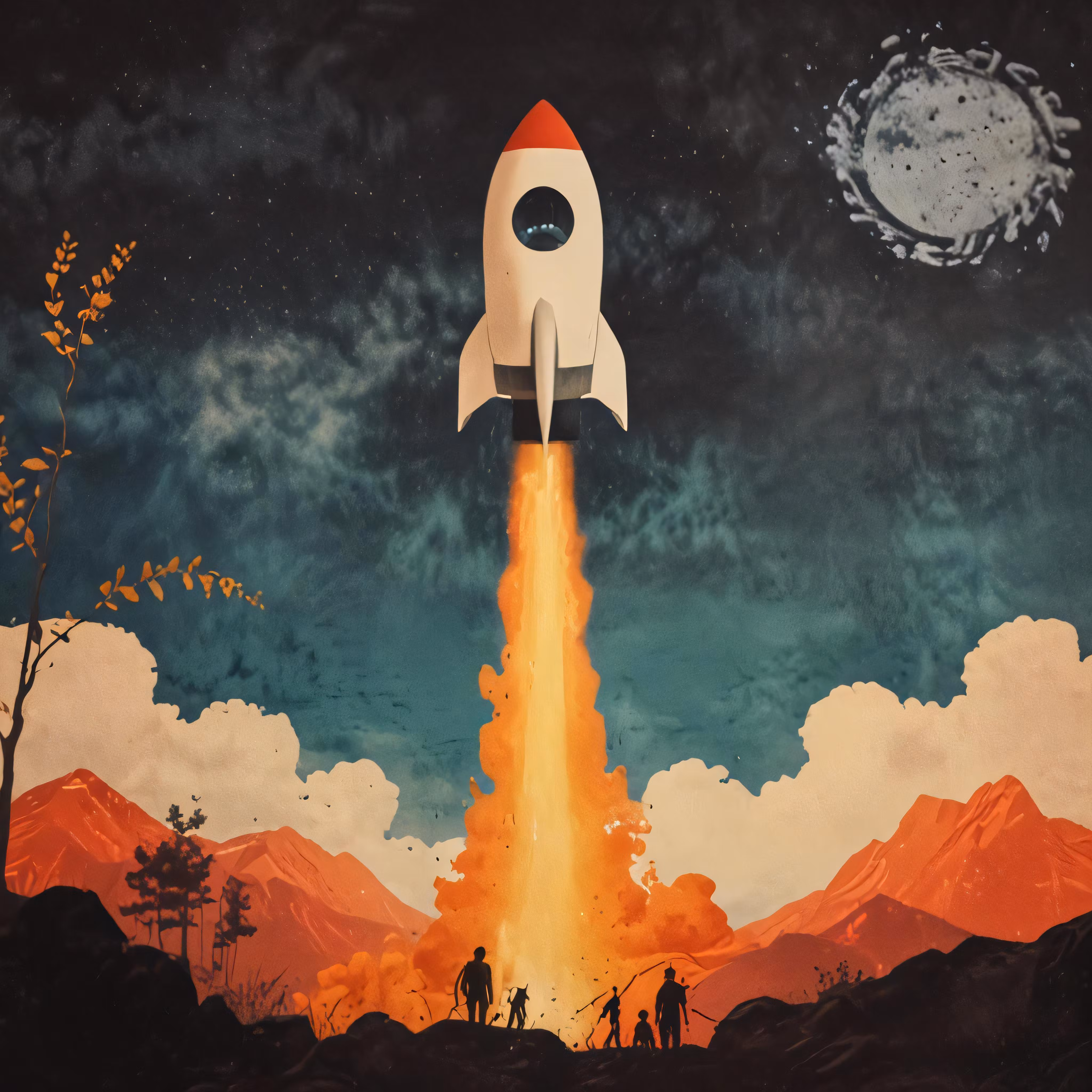 High resolution picture, free to use, a drawing of a rocket launching on a mountain
