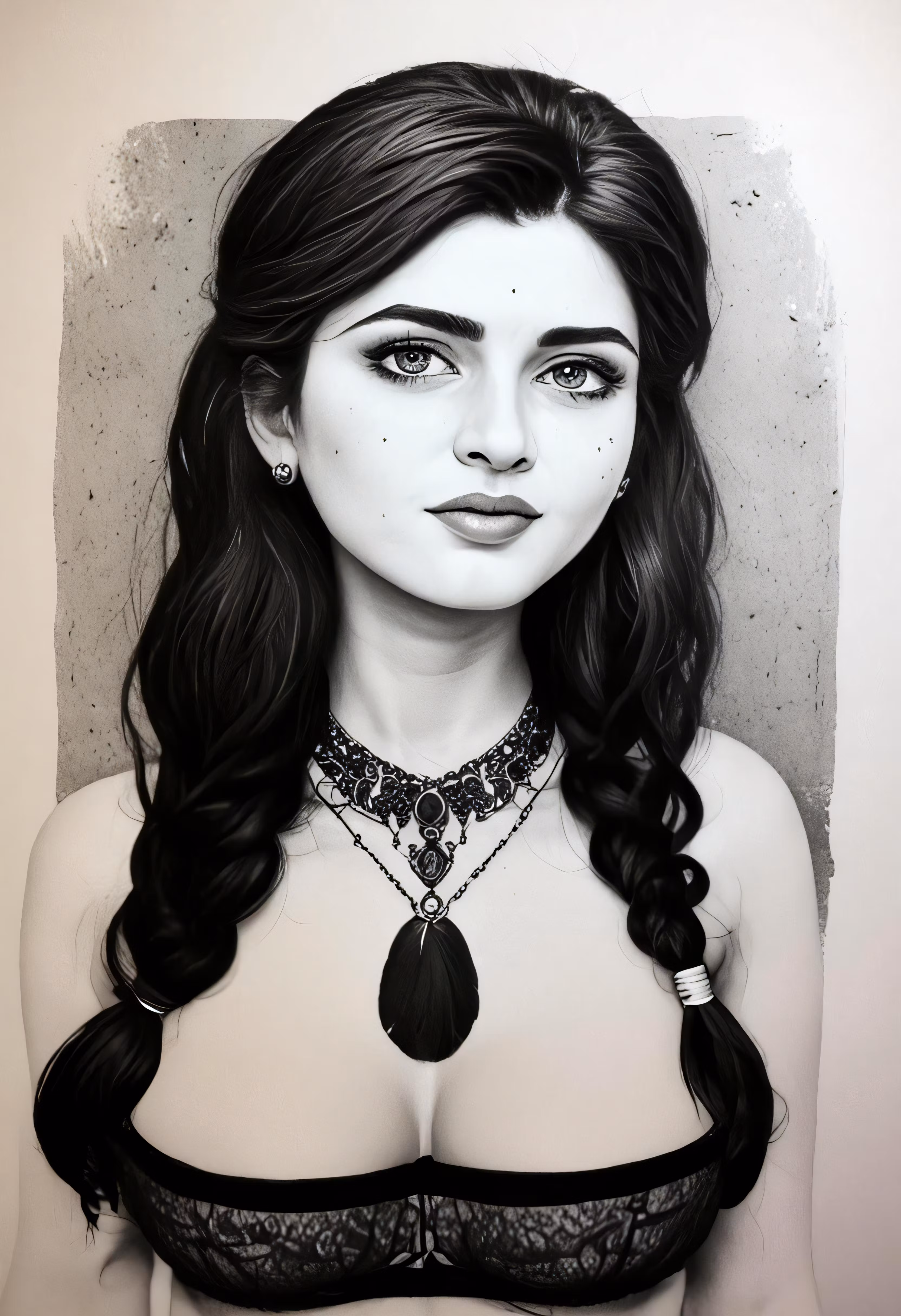 High resolution picture, free to use, a drawing of a woman wearing a bra and necklace
