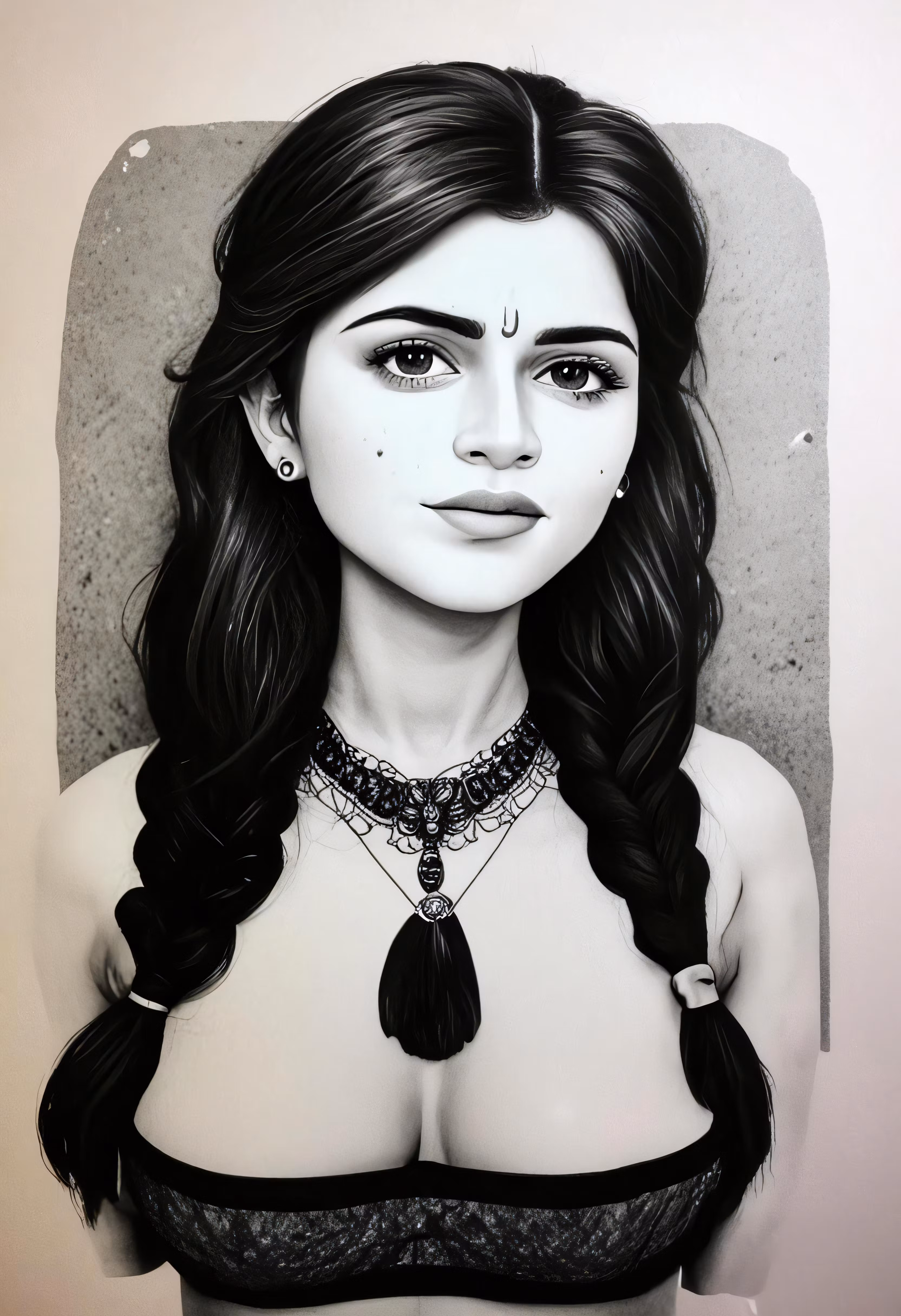 High resolution picture, free to use, a drawing of a woman wearing a bra with long hair
