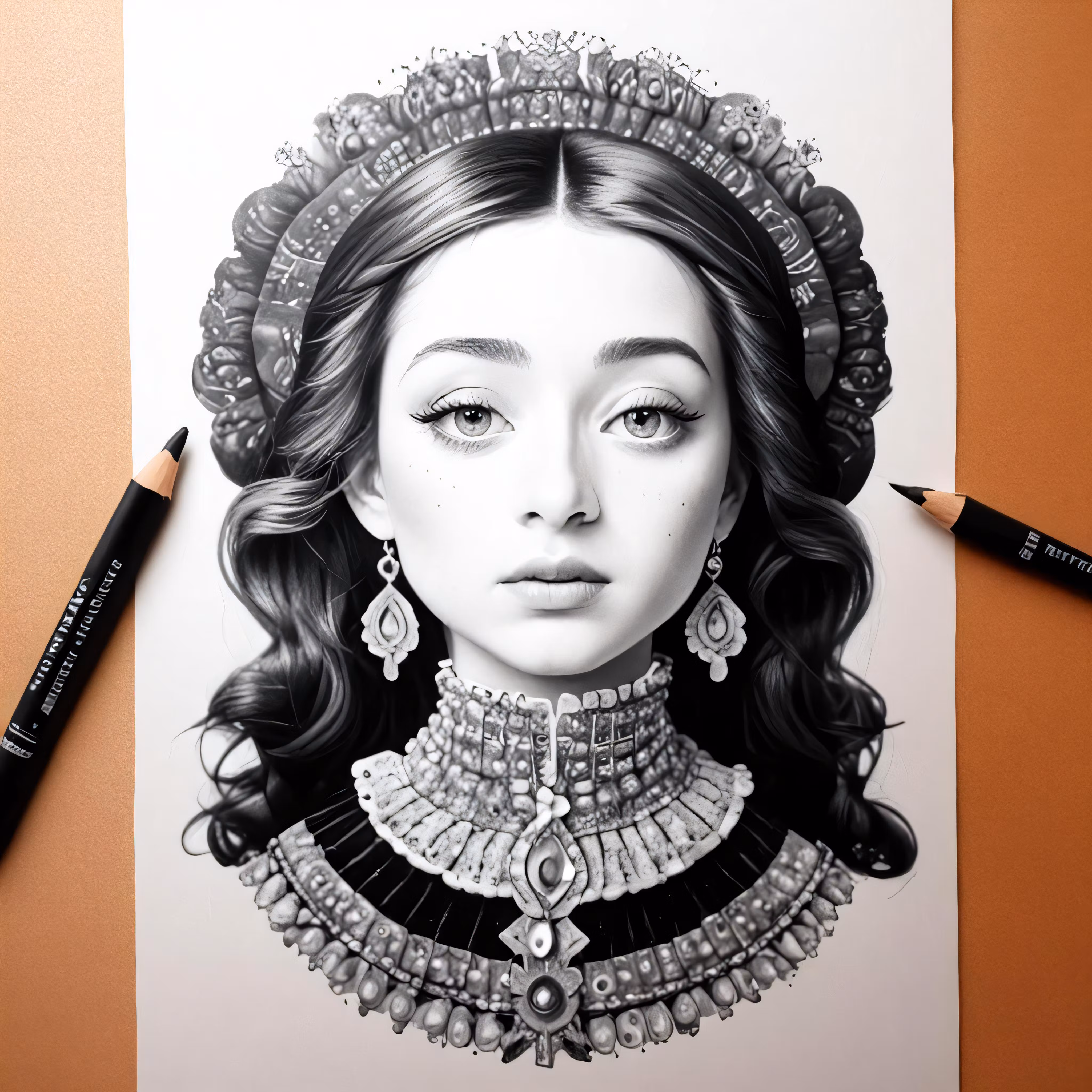High resolution picture, free to use, a drawing of a woman with long dark hair and earrings