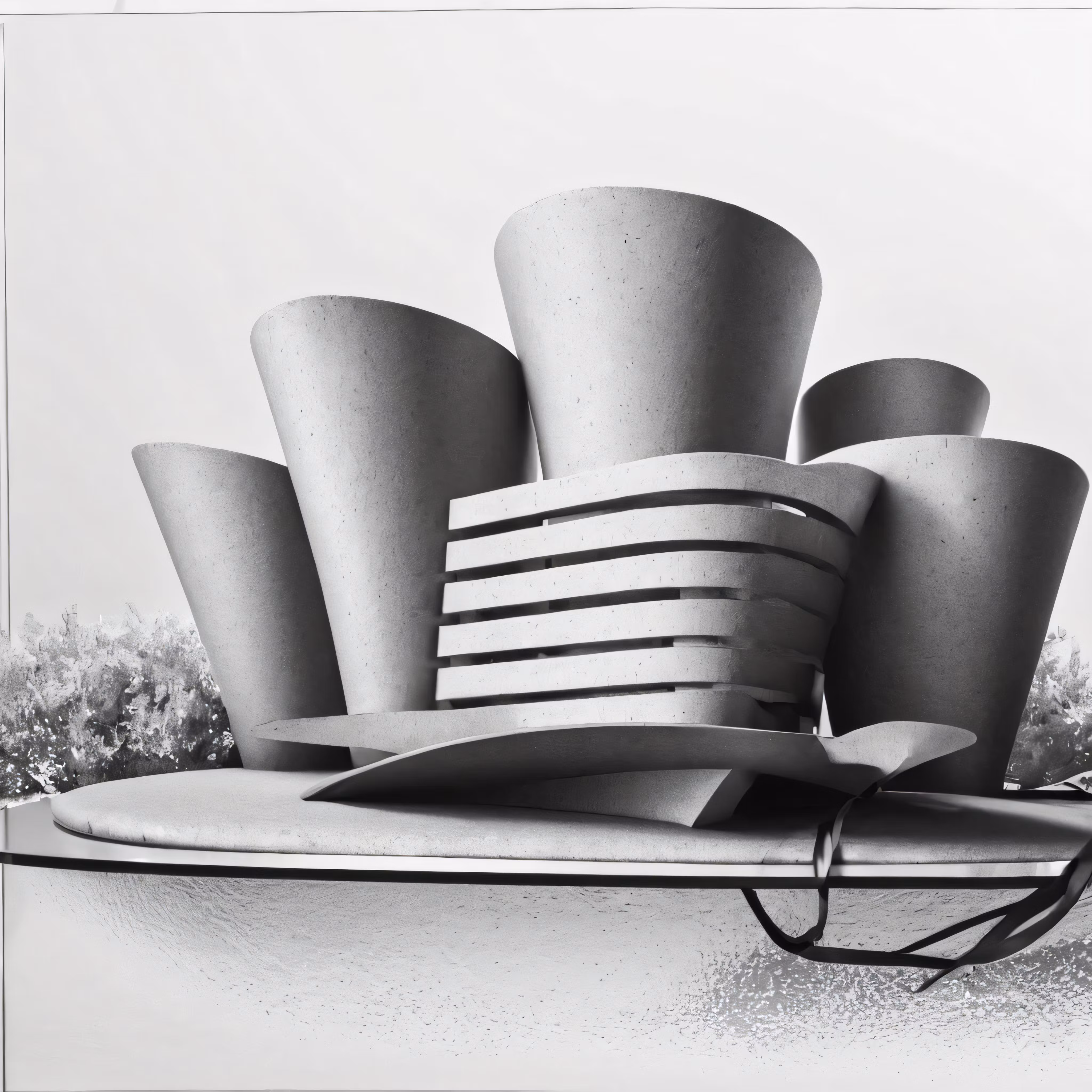 High resolution picture, free to use, a drawing of an architectural structure with many hats and curves on top of each other