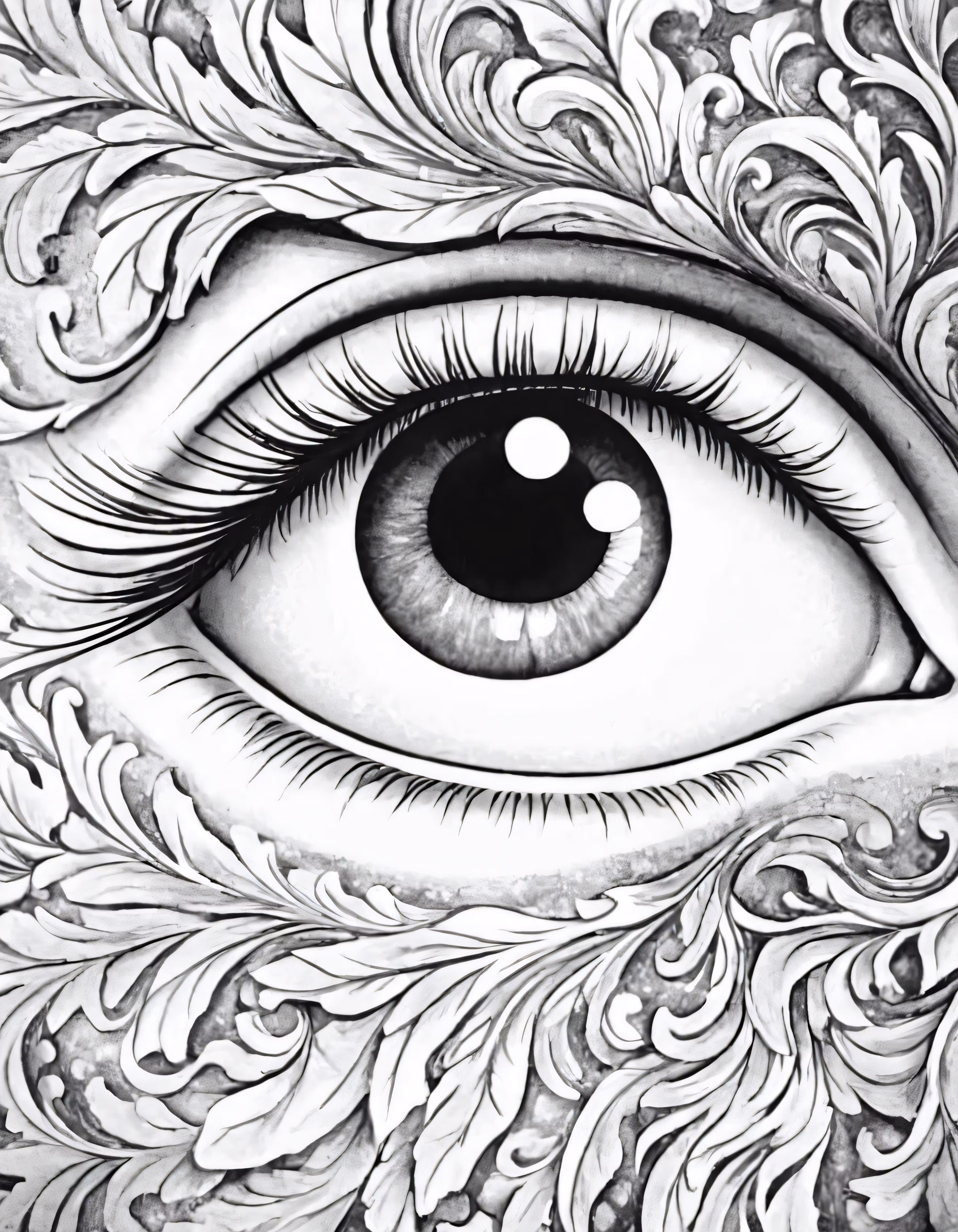 High resolution picture, free to use, a drawing of an eye with intricate foliage on the bottom