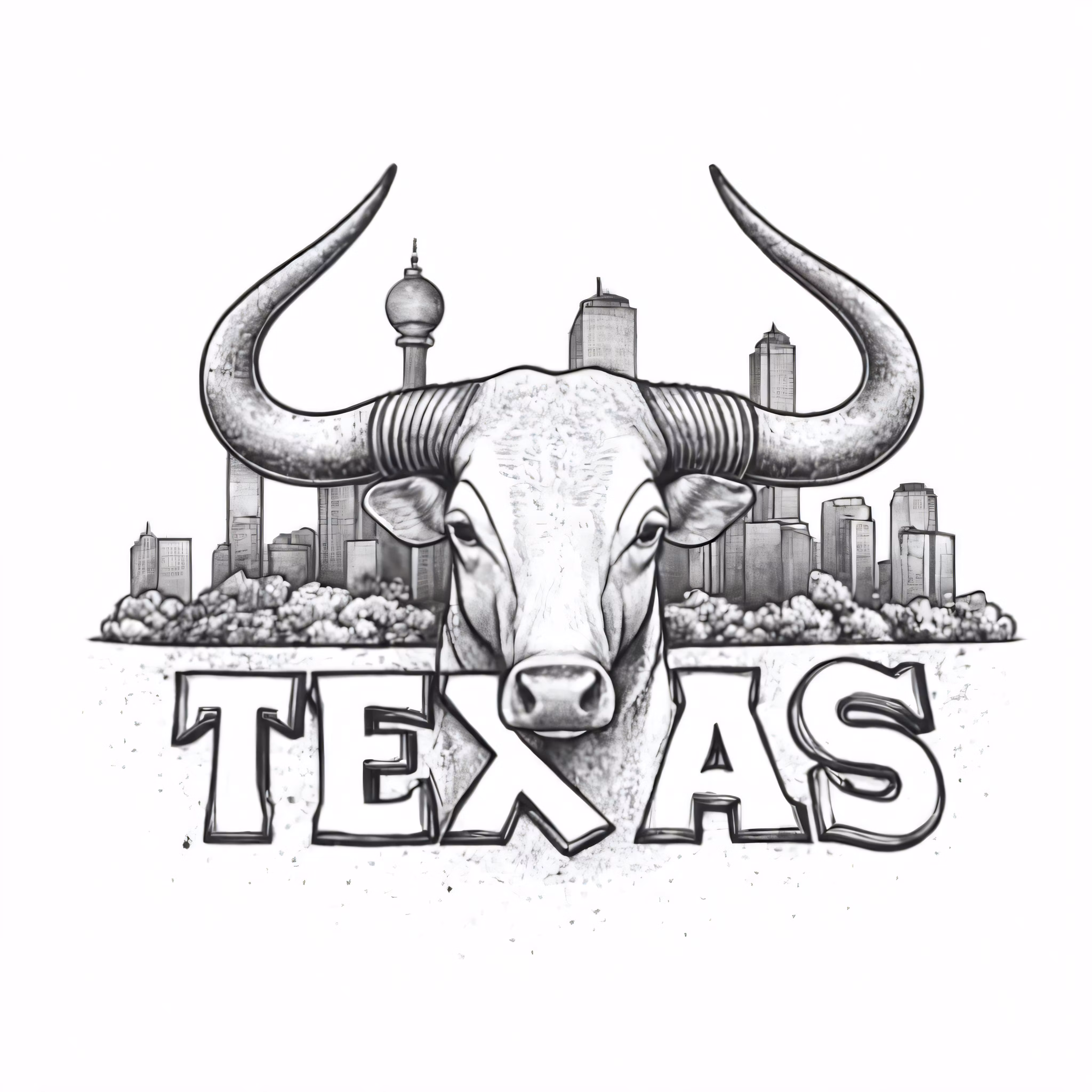 High resolution picture, free to use, a drawing of the city skyline and long horn texas