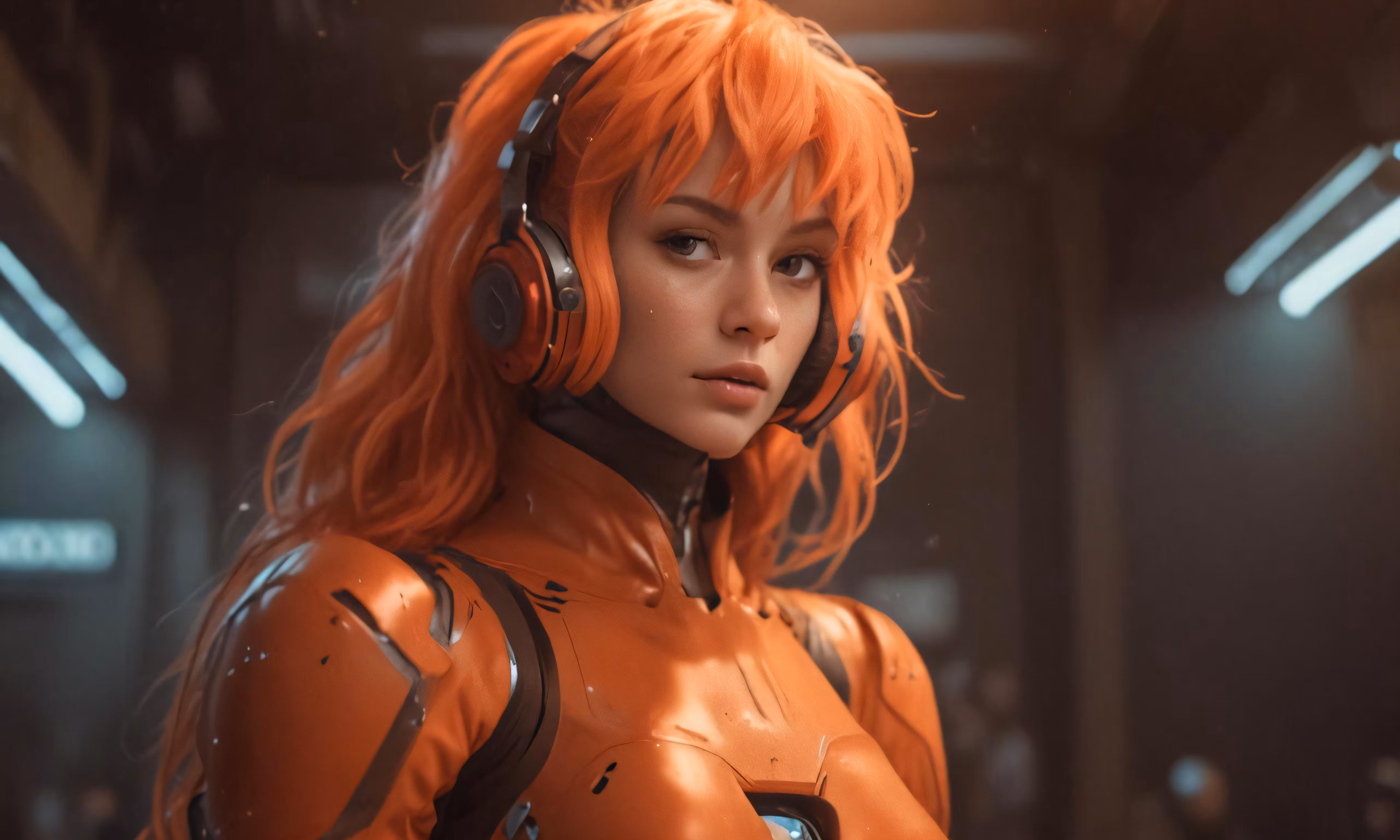 High resolution picture, free to use, a female cosplay in an orange leather outfit with headphones