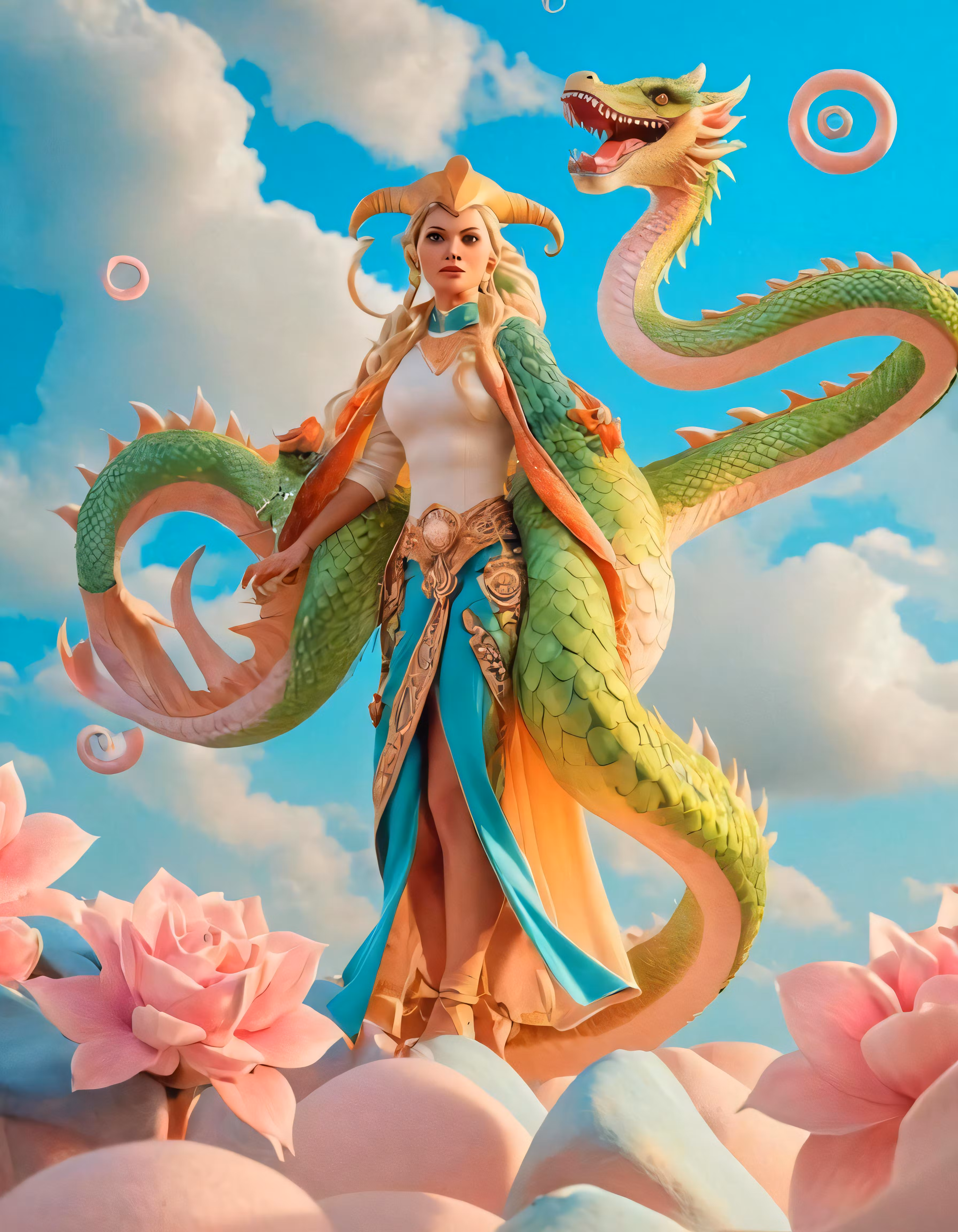 High resolution picture, free to use, a female figure surrounded by pink flowers and a dragon