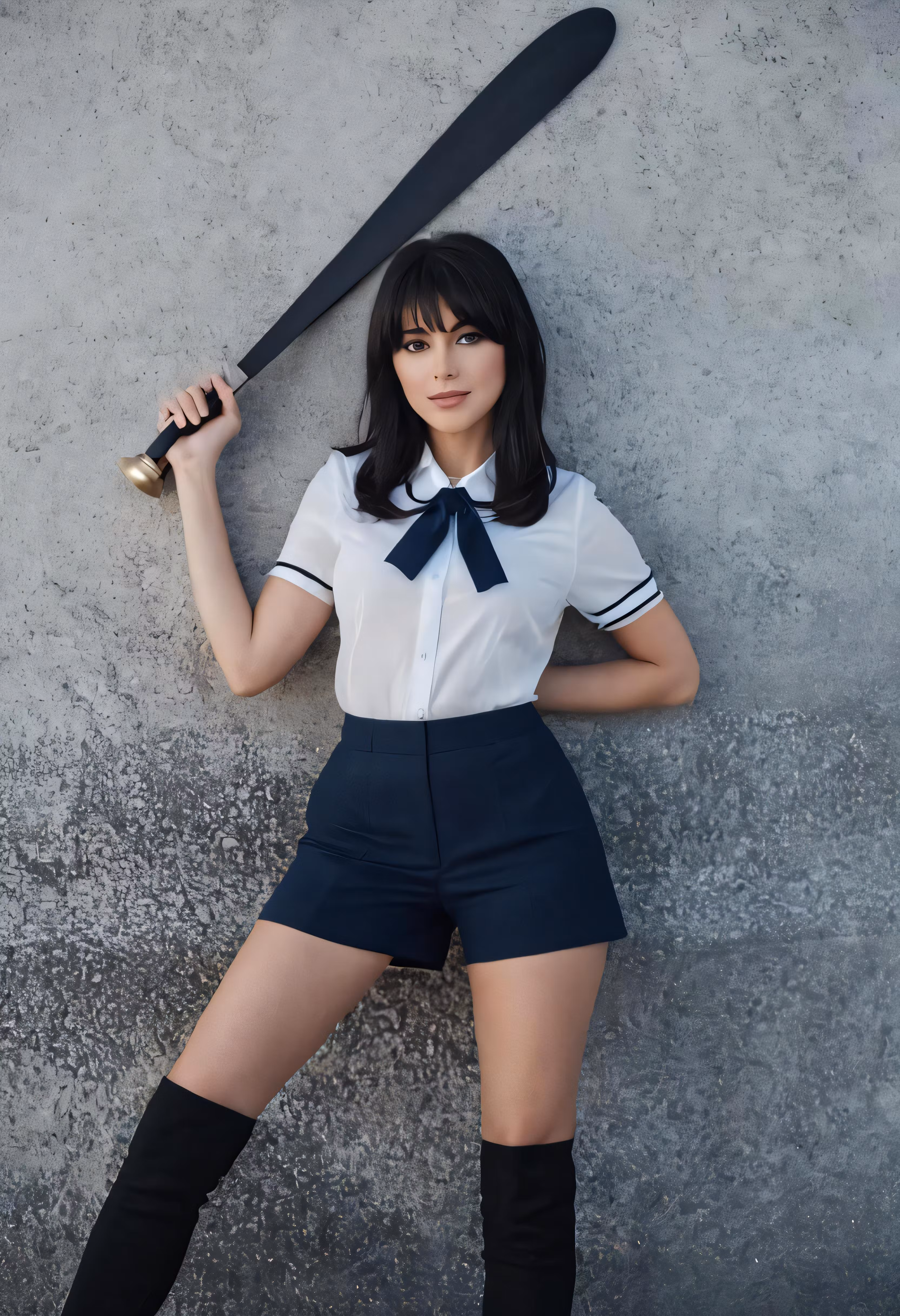 High resolution picture, free to use, a female model with short hair and wearing a uniform with her hands on a bat