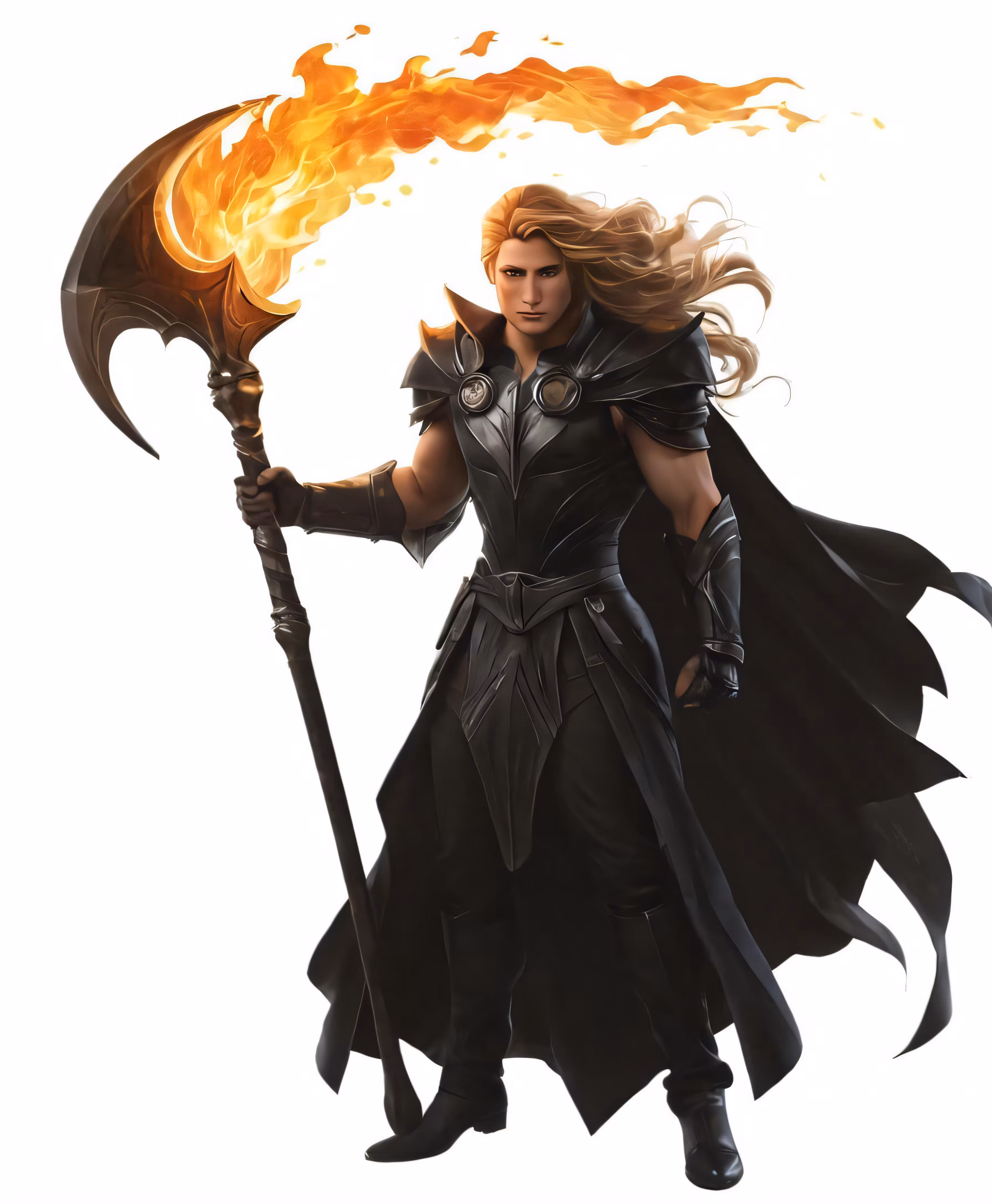 High resolution picture, free to use, a female warrior with a fire staff holding a flame