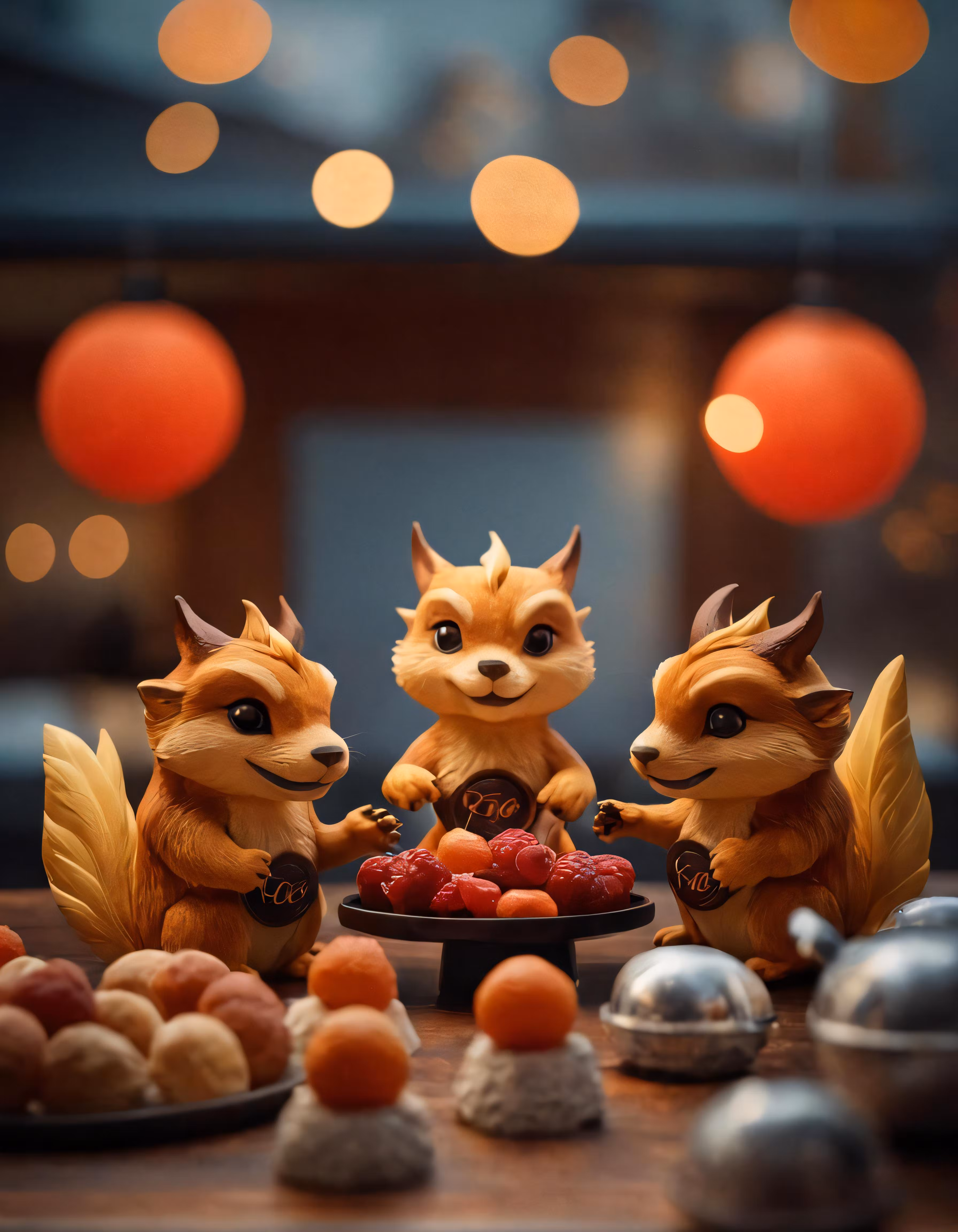High resolution picture, free to use, a few small little figurines of foxes holding berry