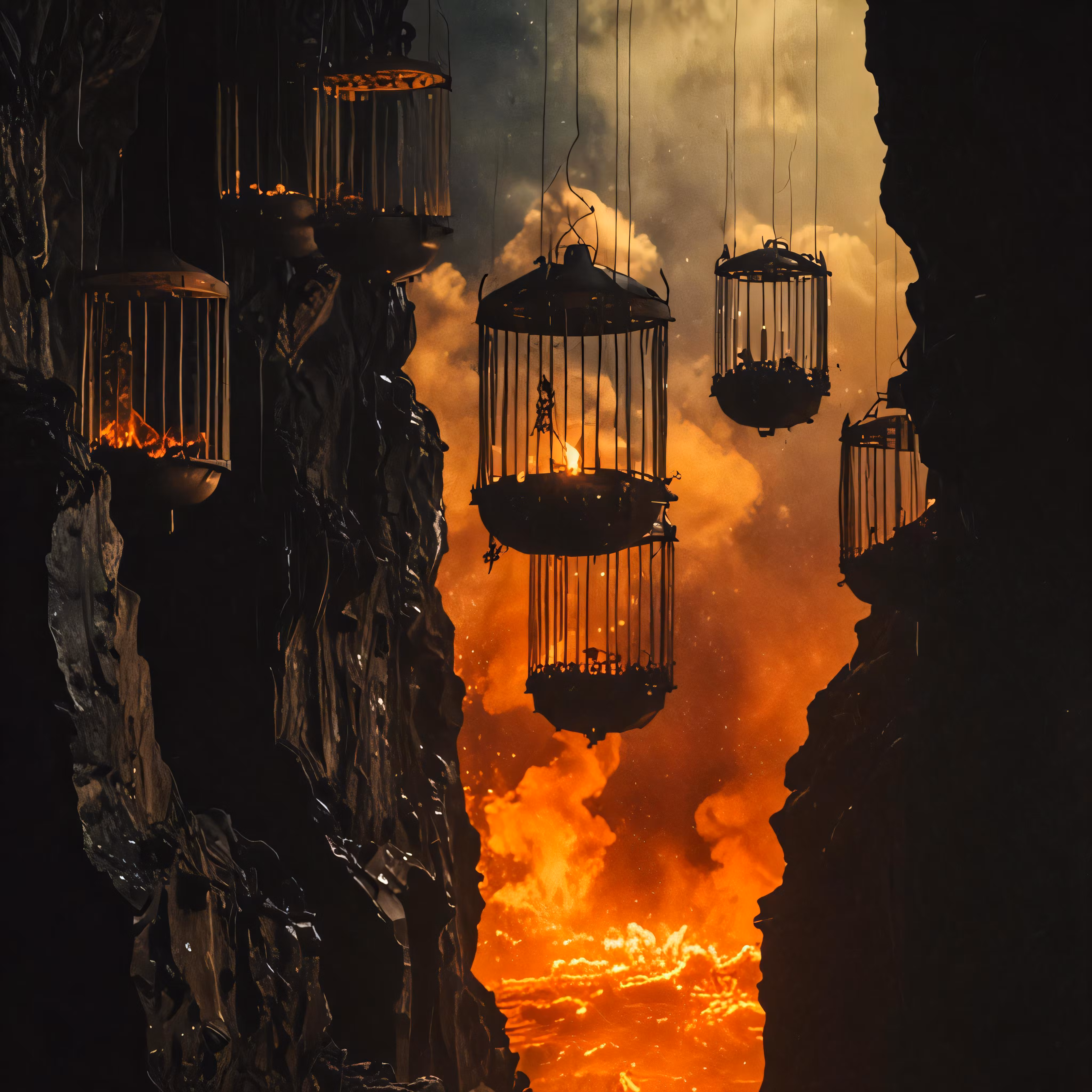 High resolution picture, free to use, a fire blazing in a dark tunnel with lots of cages hanging from the ceiling