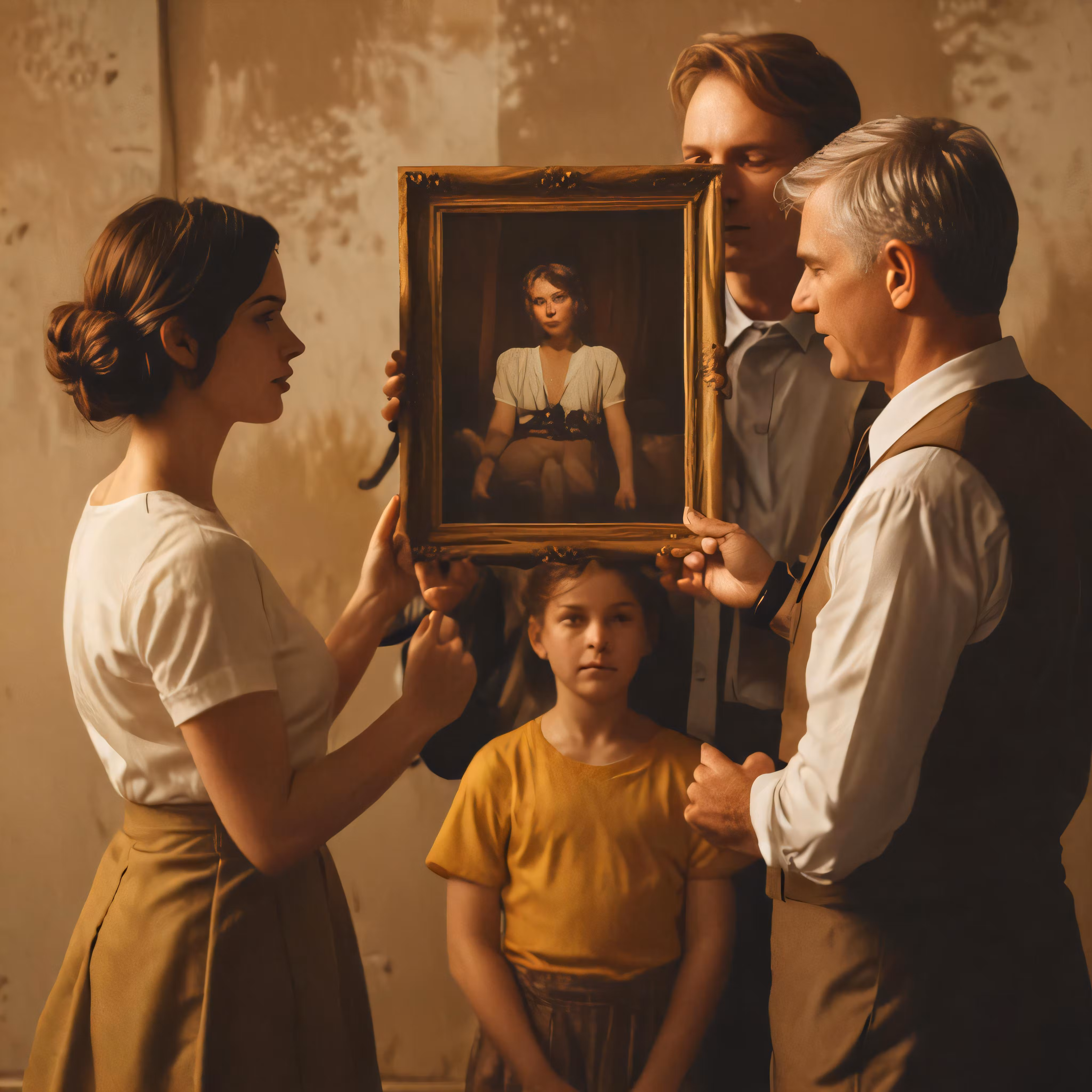 High resolution picture, free to use, a girl holding an image of a woman being put on by the family