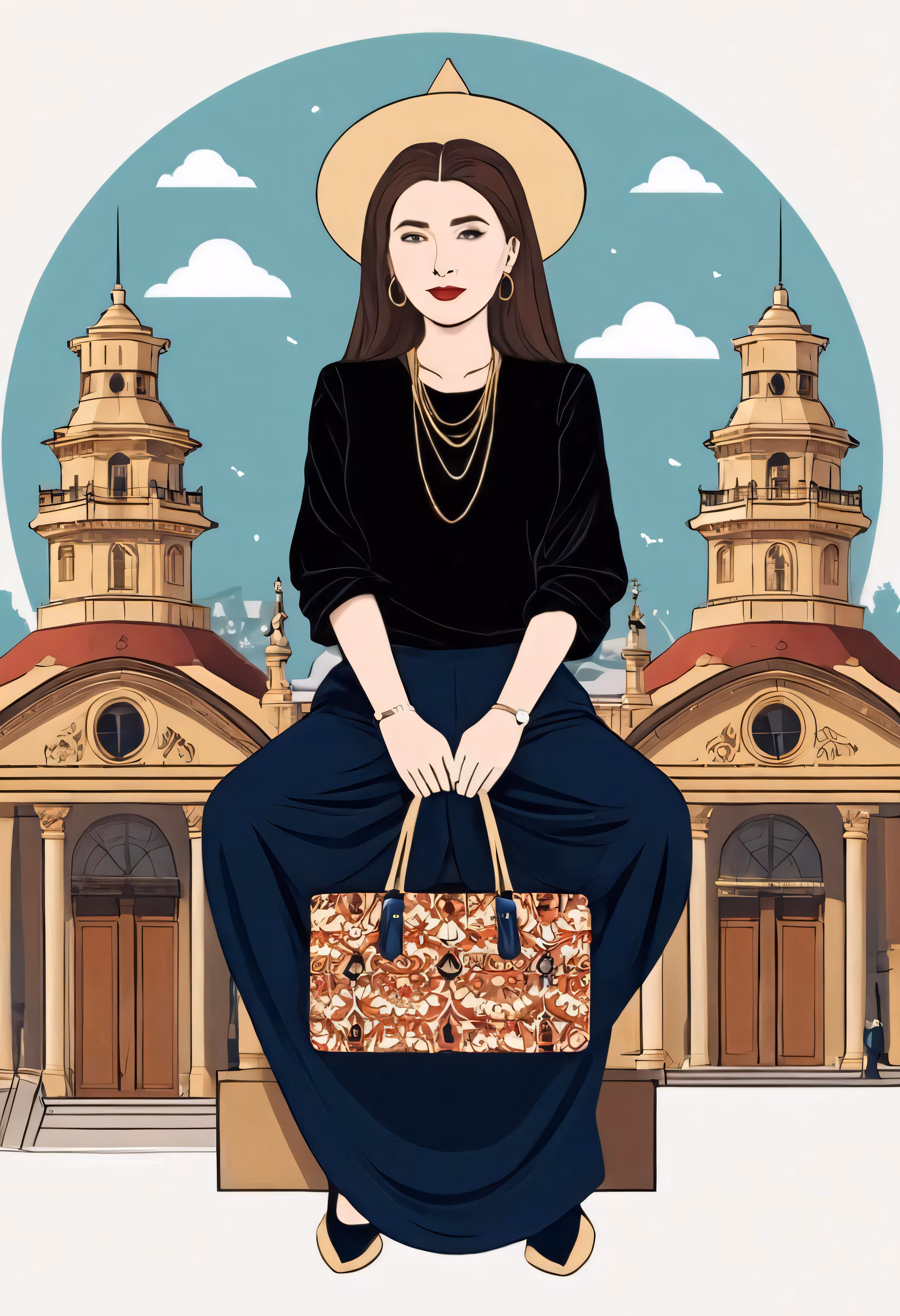 High resolution picture, free to use, a girl in an animal   print purse is sitting down with her handbag