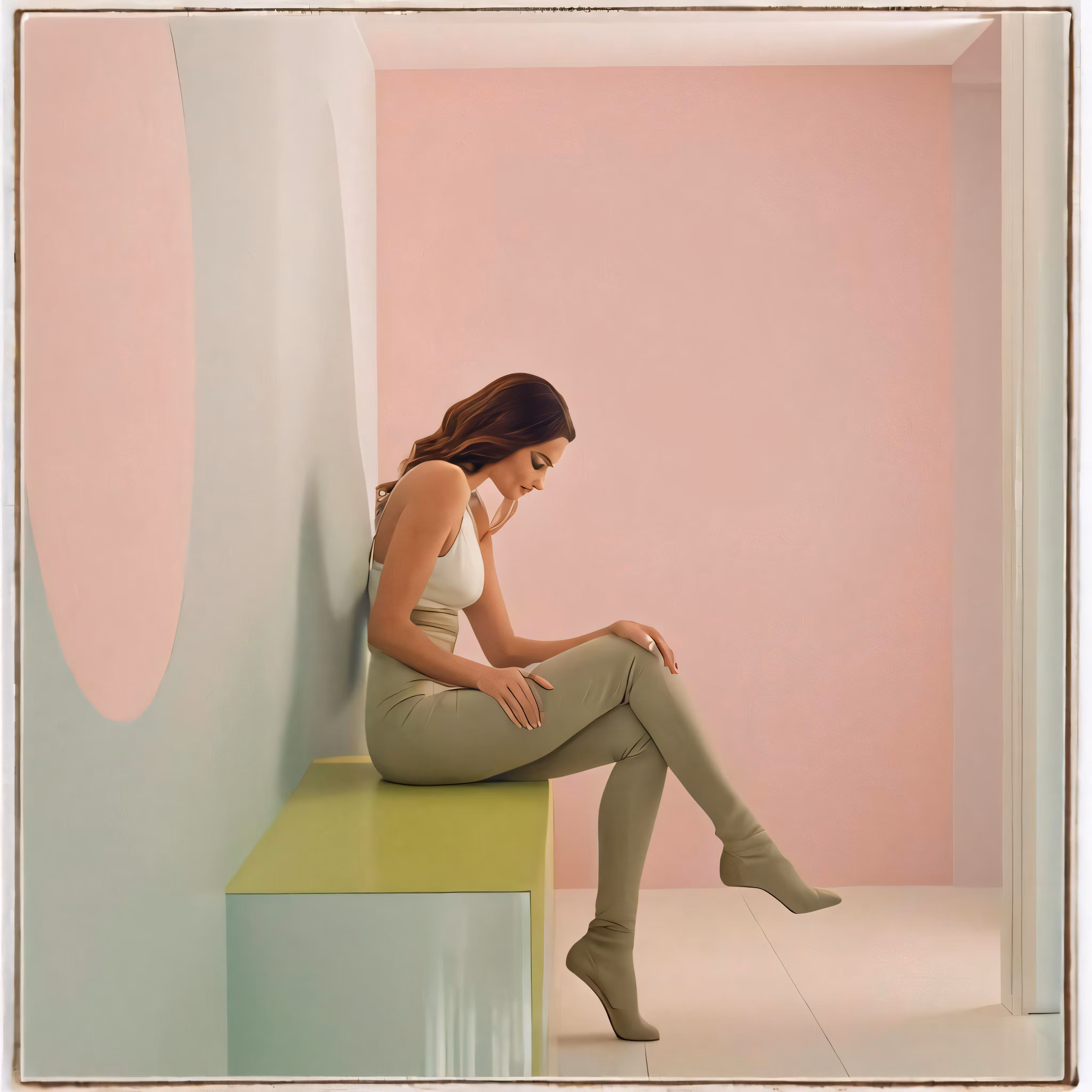 High resolution picture, free to use, a girl in tight clothing sitting on top of a box
