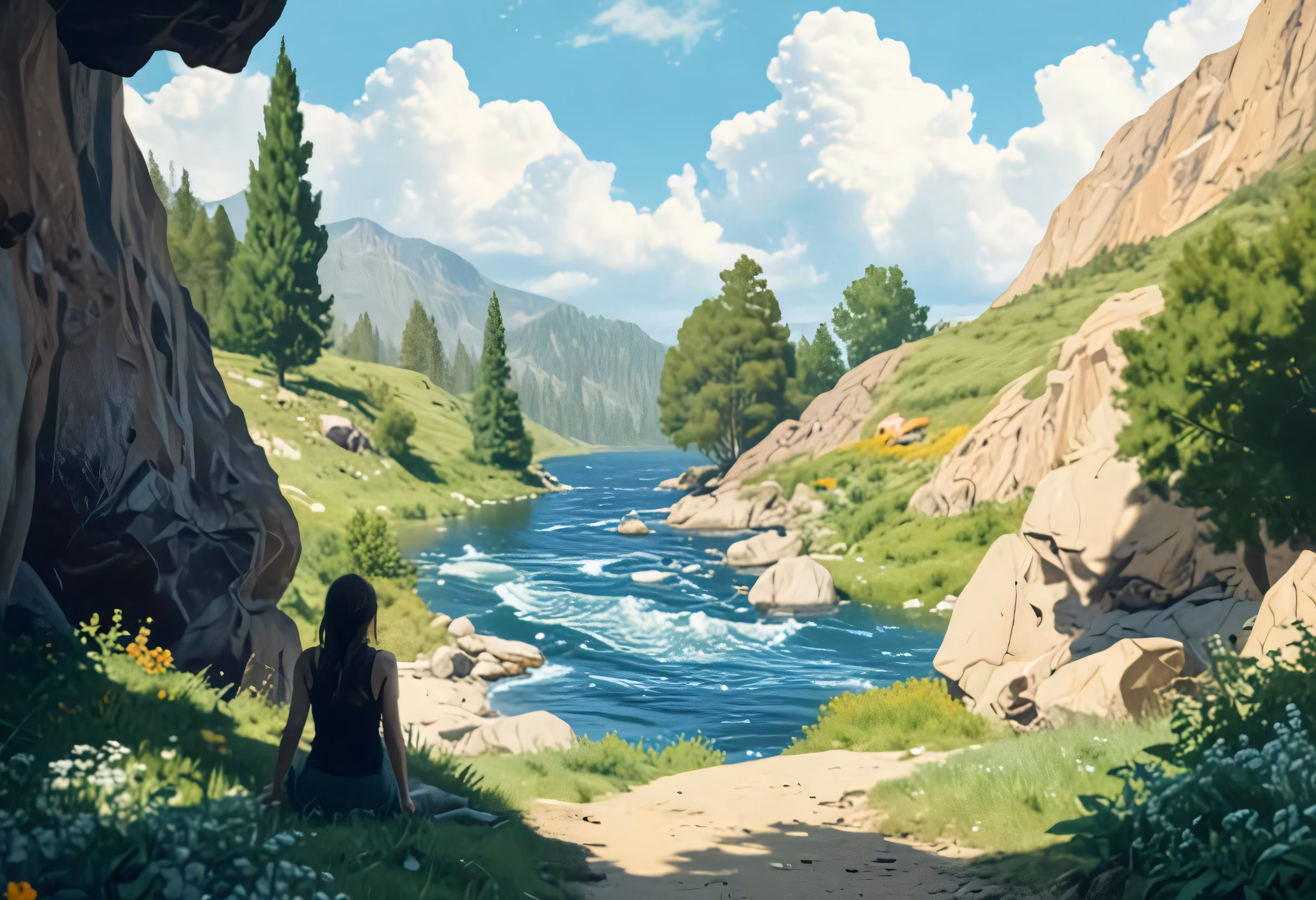 High resolution picture, free to use, a girl is sitting at the end of a small path looking out onto the water