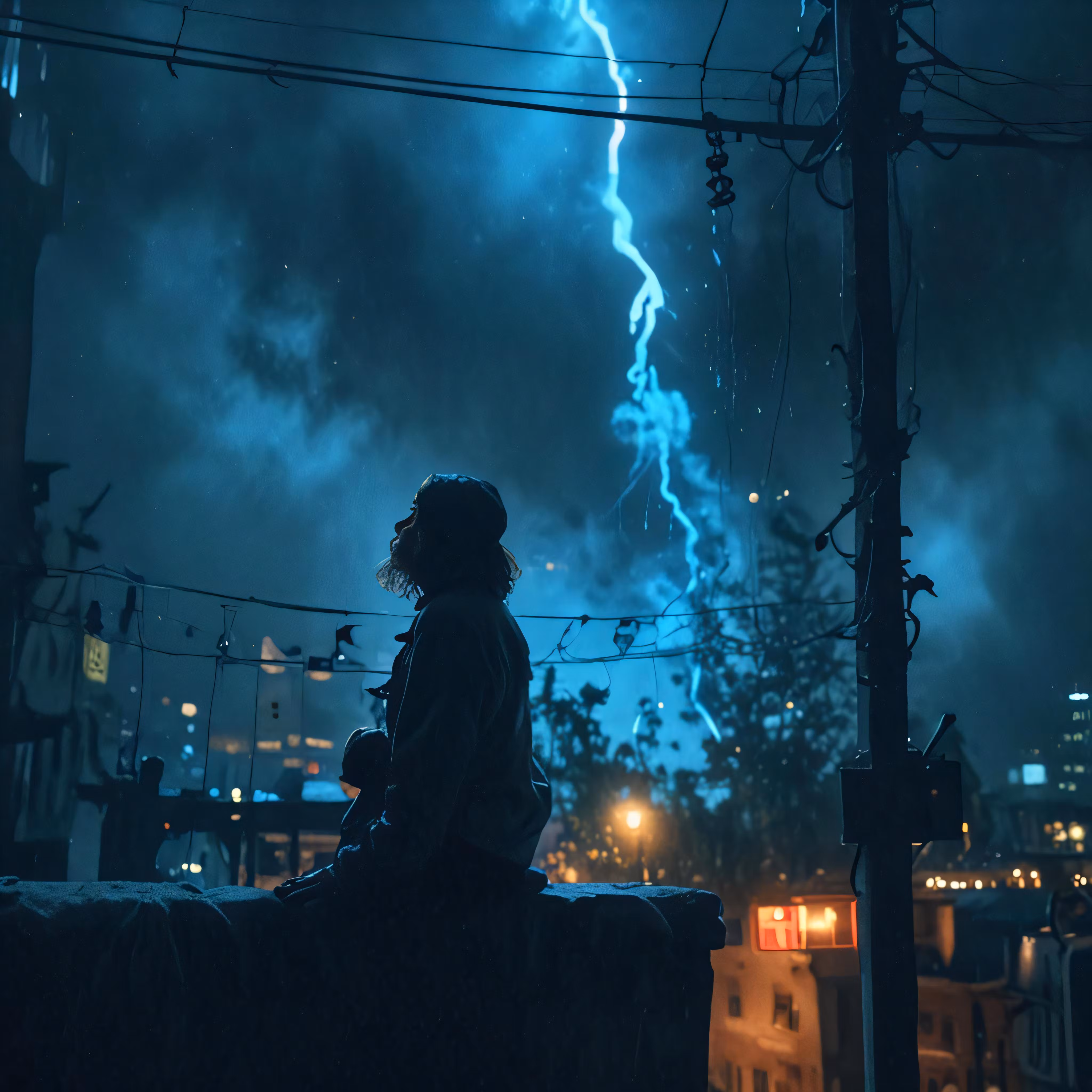 High resolution picture, free to use, a girl is sitting on a ledge and watching a lightning strike