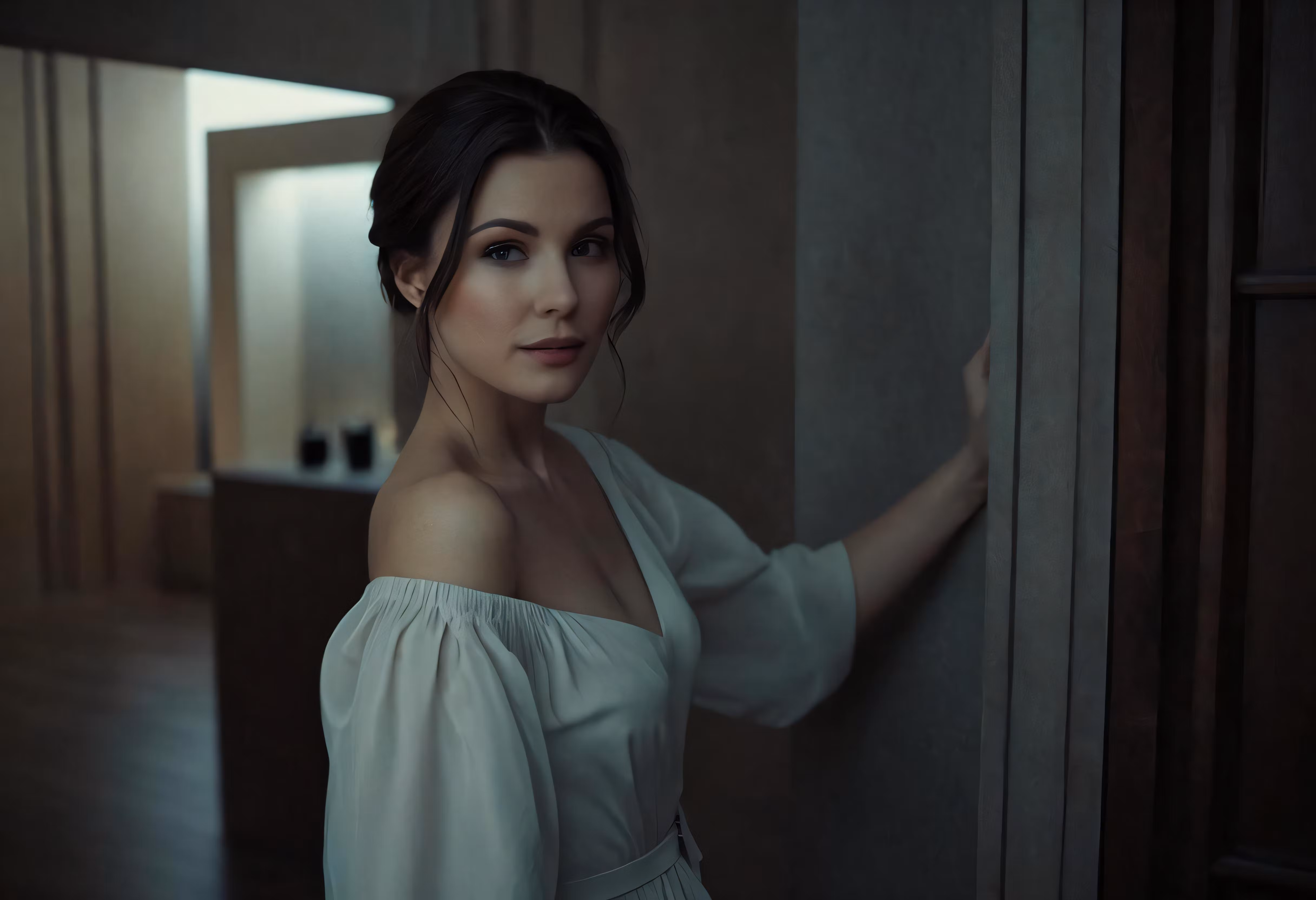 High resolution picture, free to use, a girl leaning against a wall wearing an off the shoulder blouse