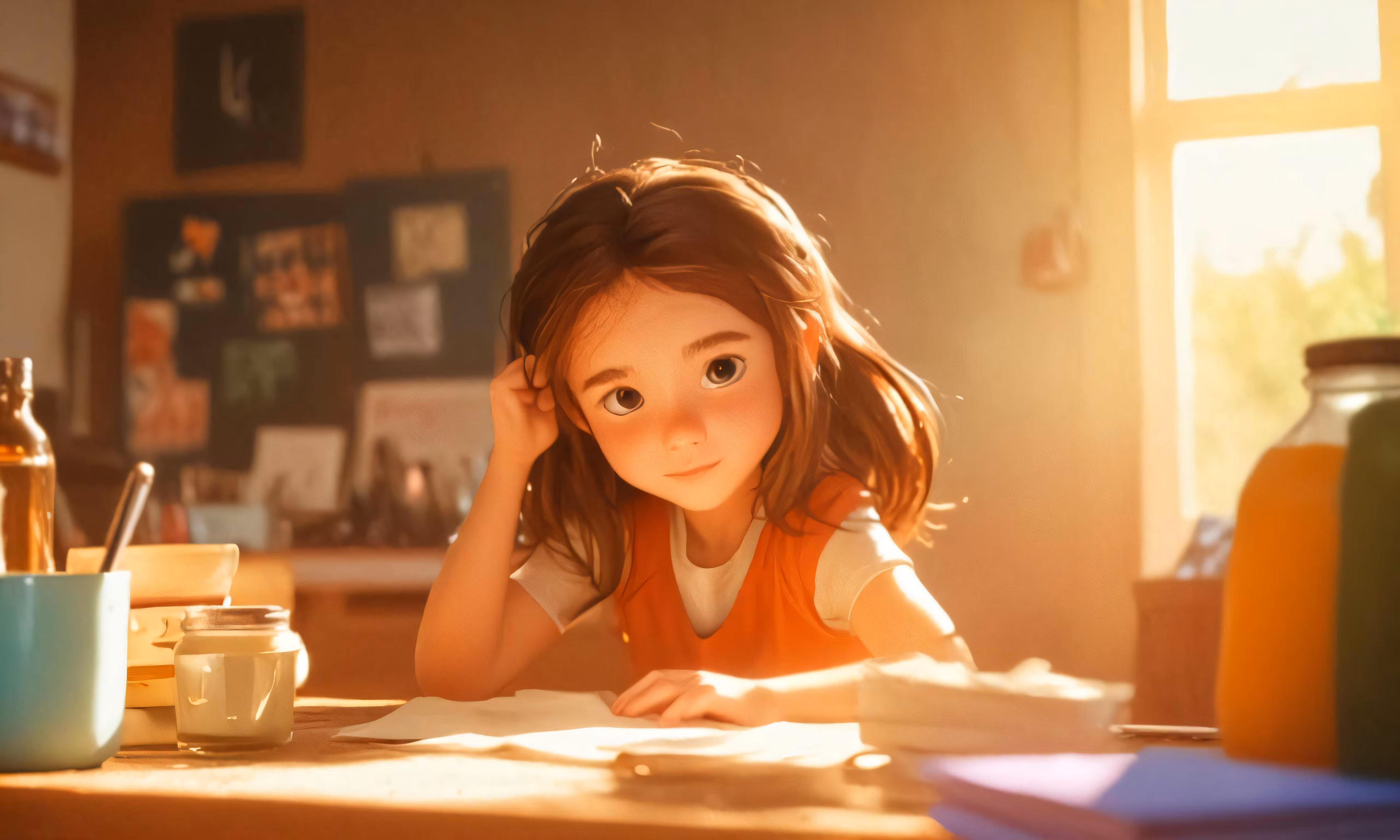 High resolution picture, free to use, a girl sitting at a desk in the sunlight reading a book