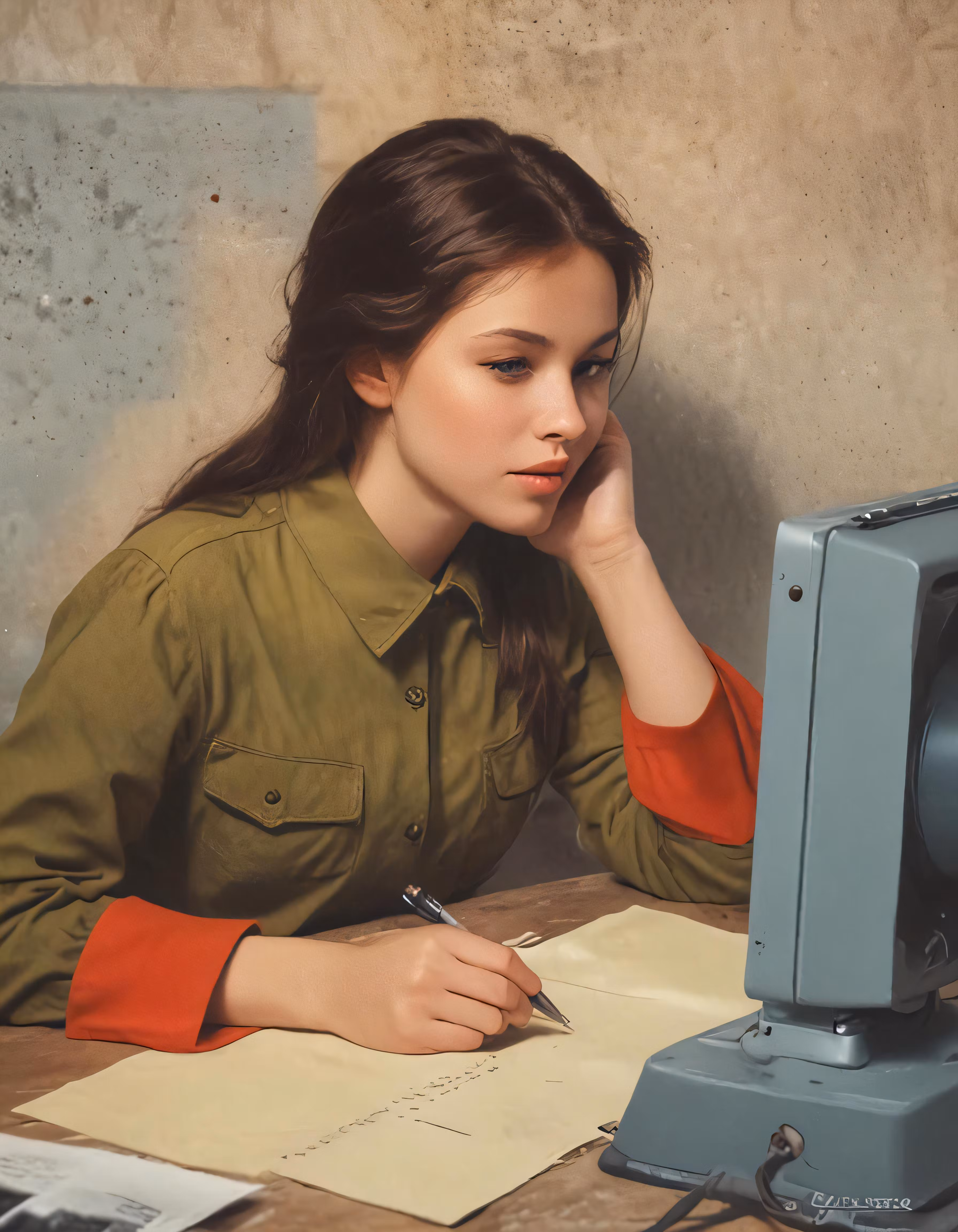 High resolution picture, free to use, a girl sitting in front of a computer desk and typing on paper