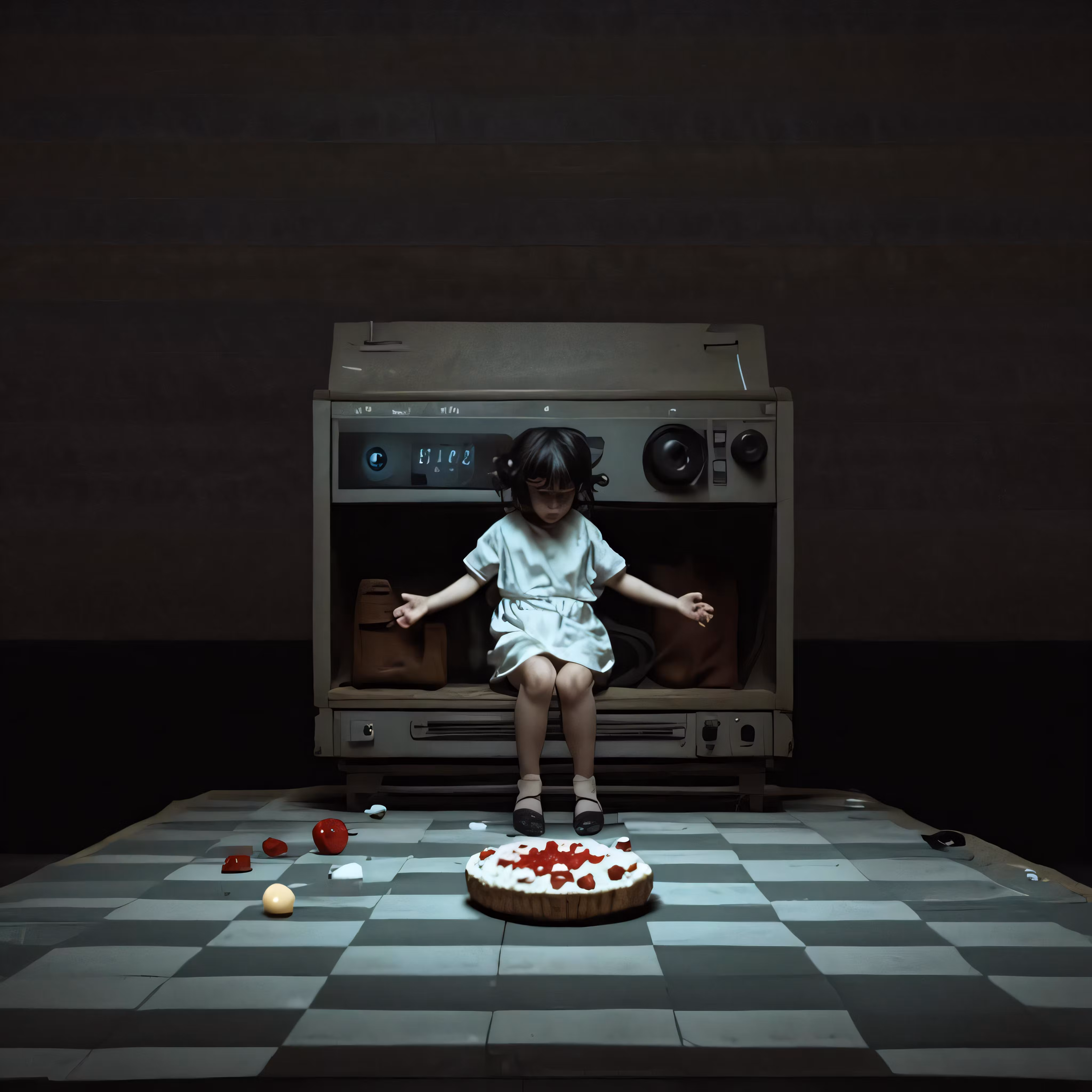 High resolution picture, free to use, a girl sitting on a table with a cake in front of a microwave