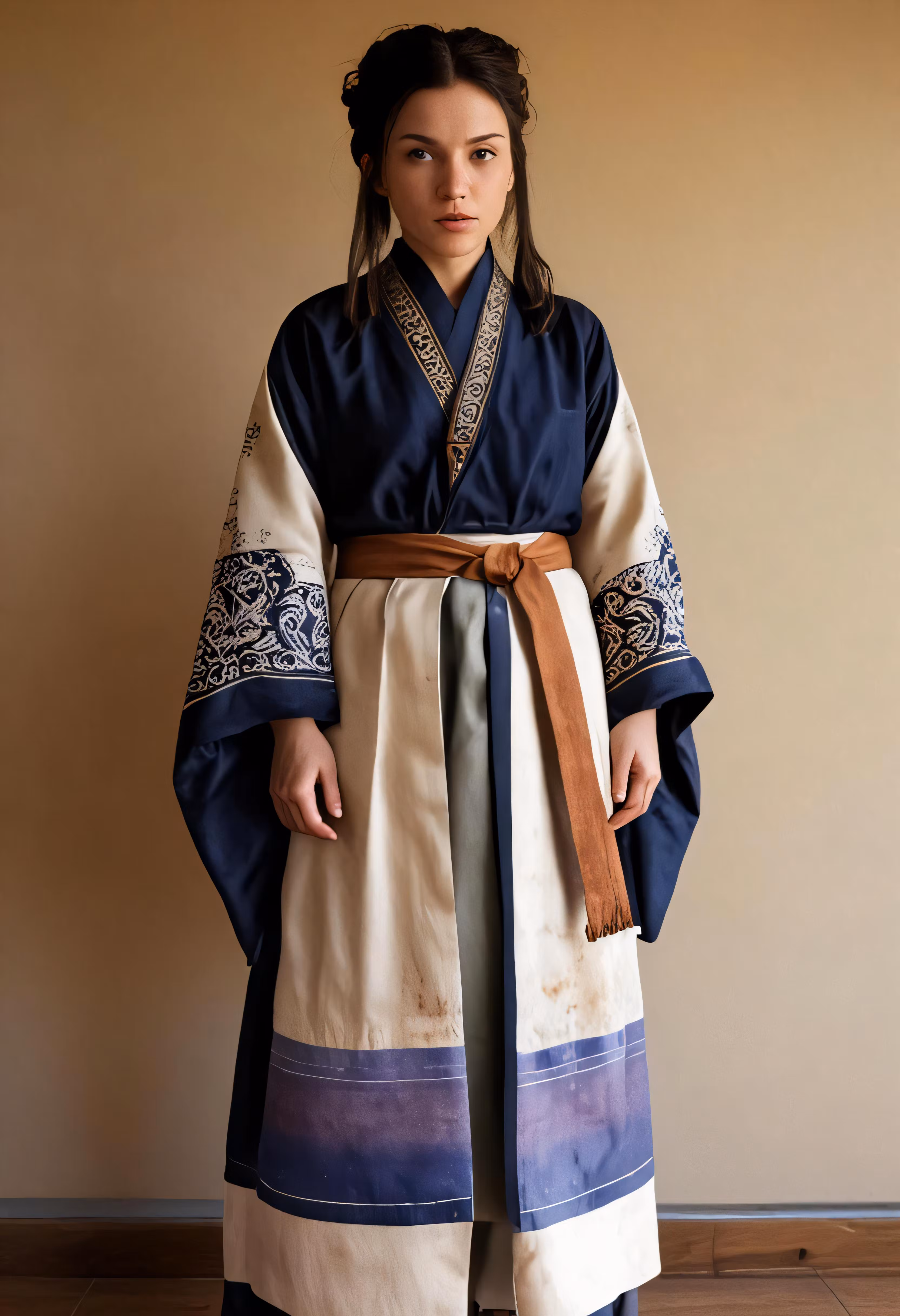 High resolution picture, free to use, a girl standing next to wall with blue and tan clothing