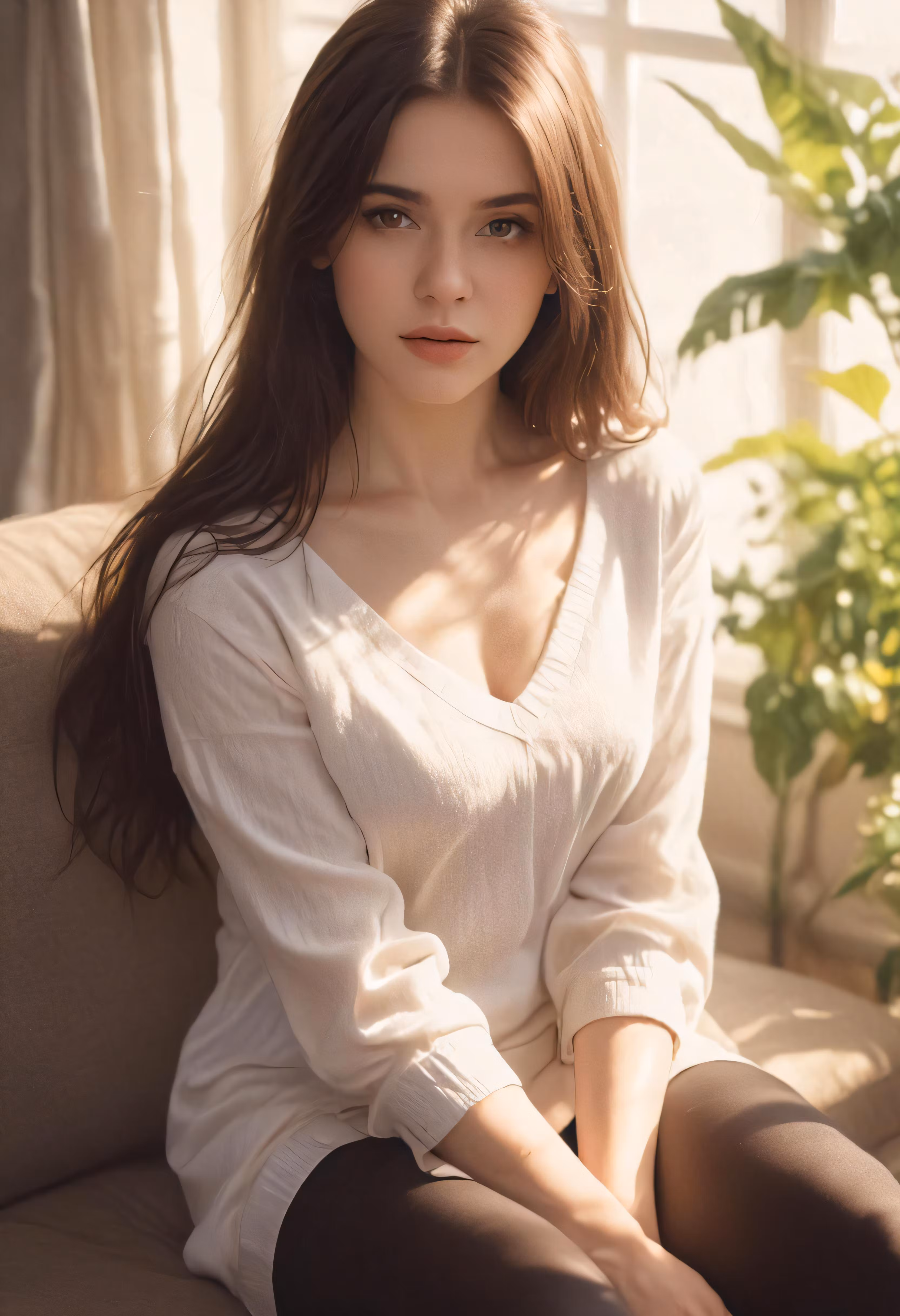 High resolution picture, free to use, a girl wearing tight pants sitting on the couch