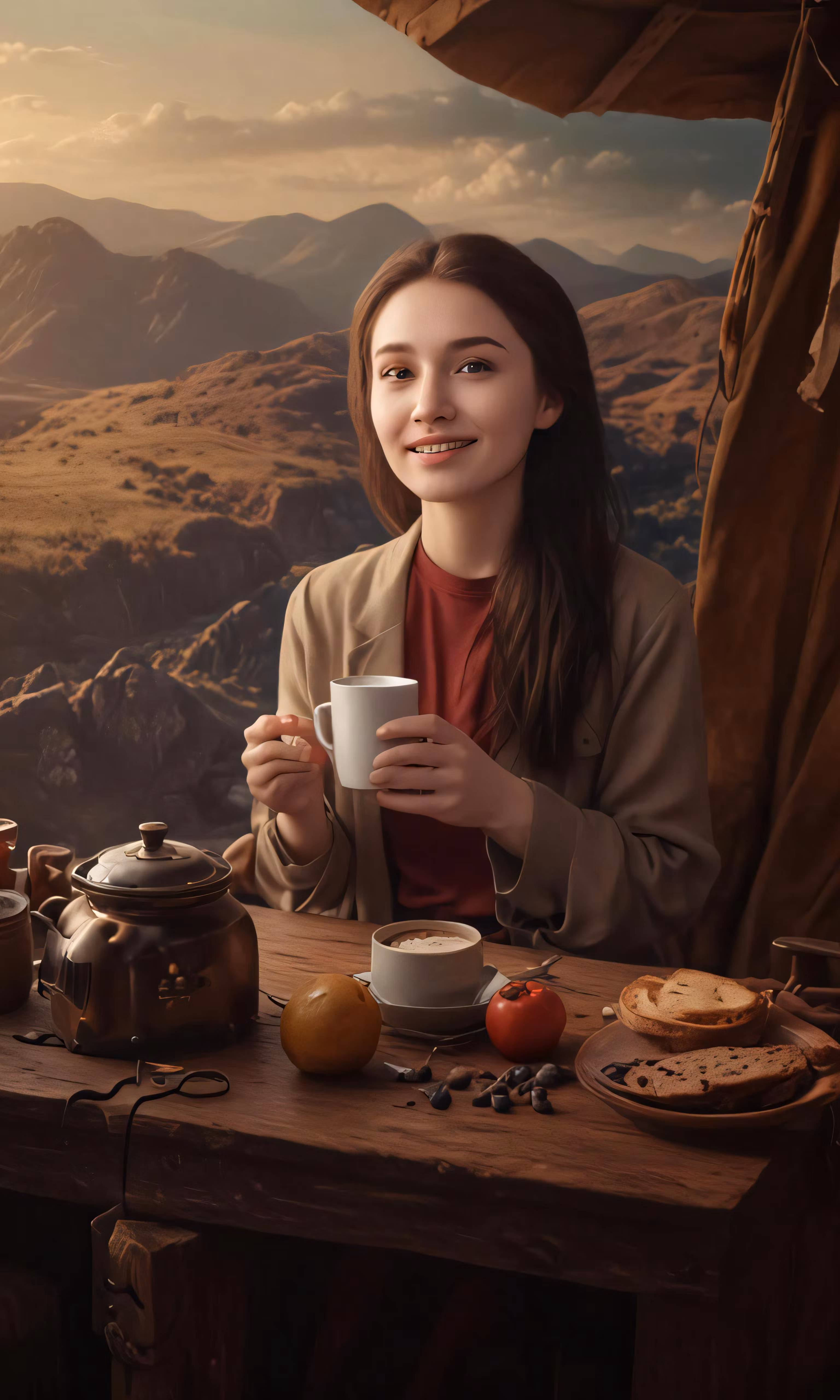 High resolution picture, free to use, a girl with a cup of coffee is on a wooden table