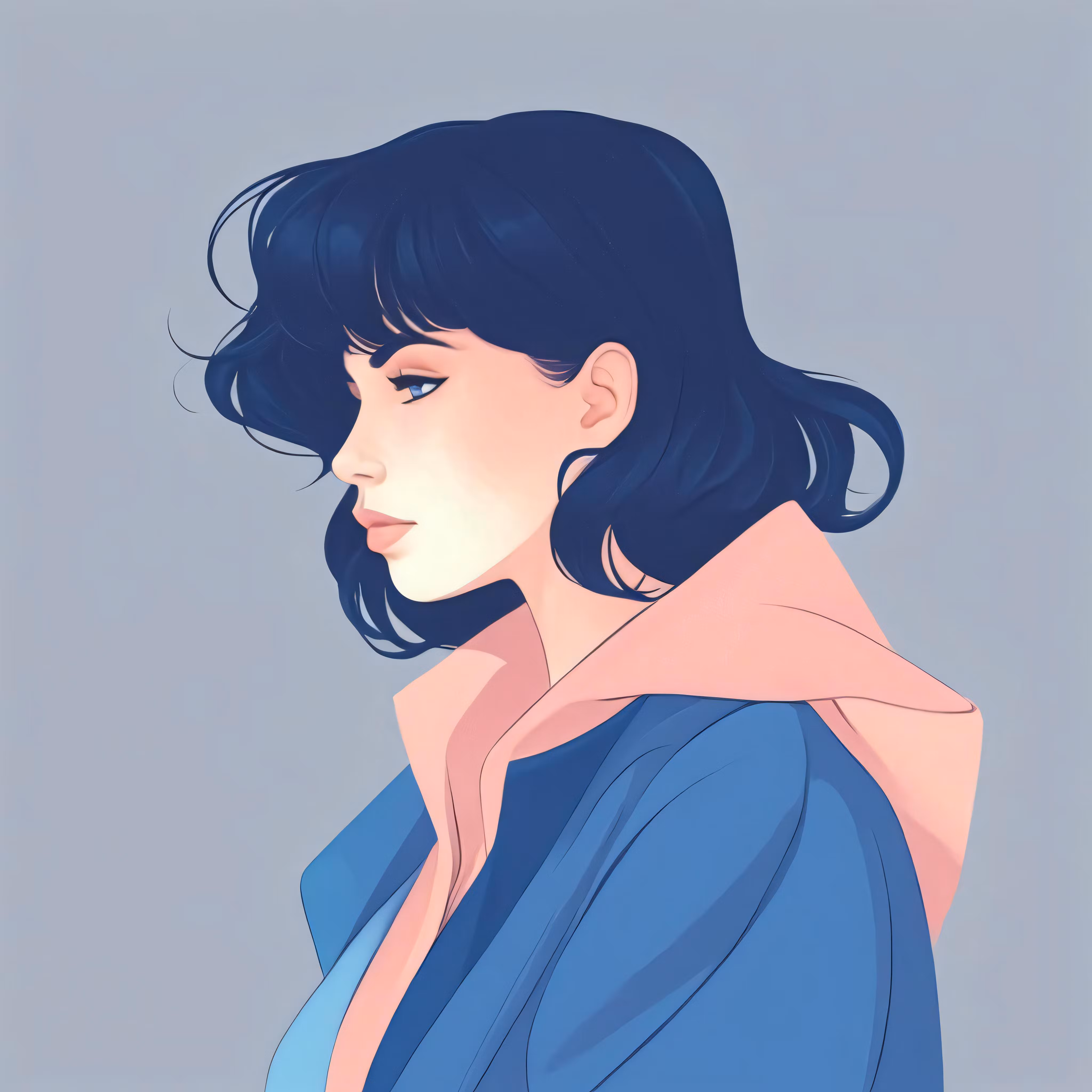 High resolution picture, free to use, a girl with black hair and blue eyes wearing a blue shirt
