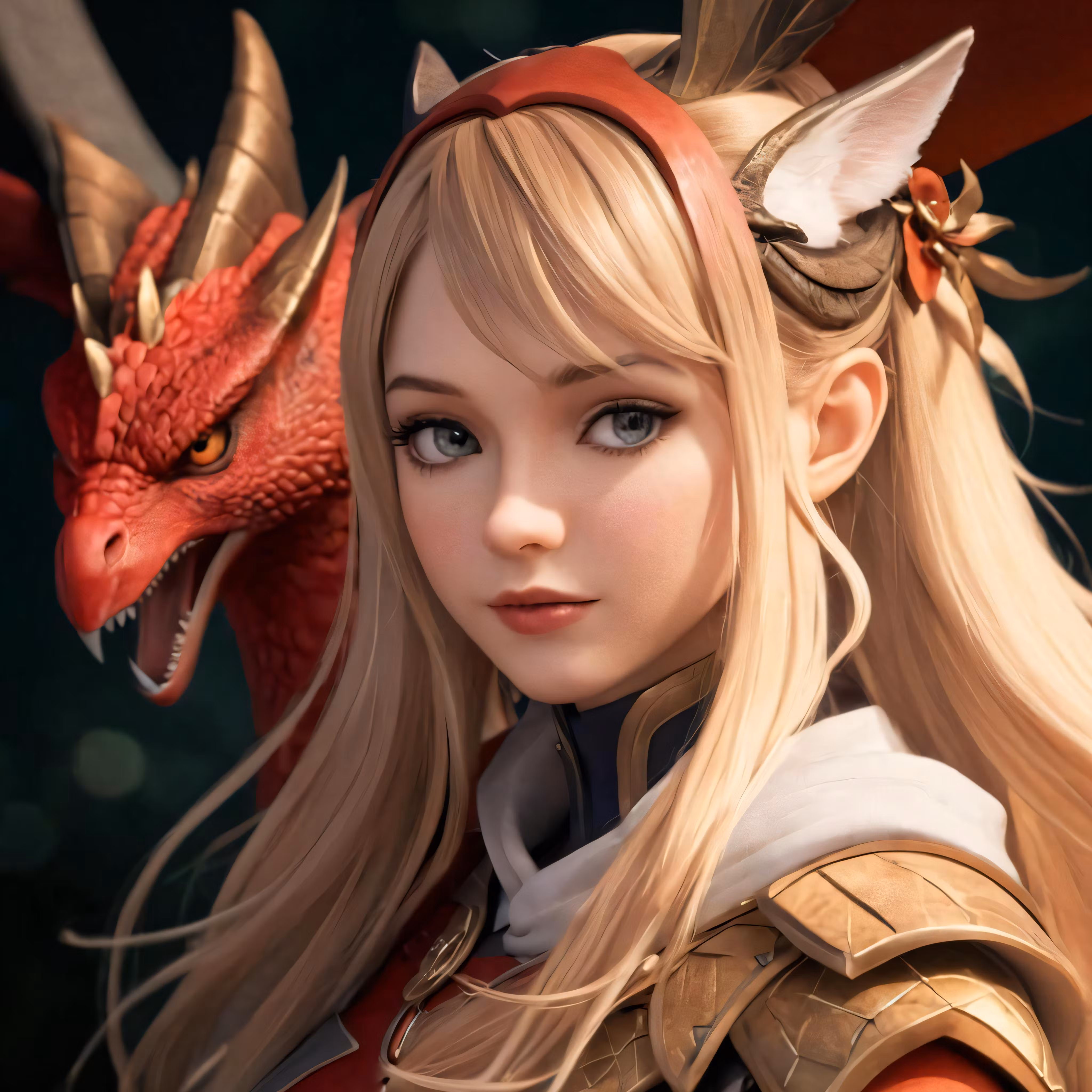 High resolution picture, free to use, a girl with blonde hair wearing armor and a dragon