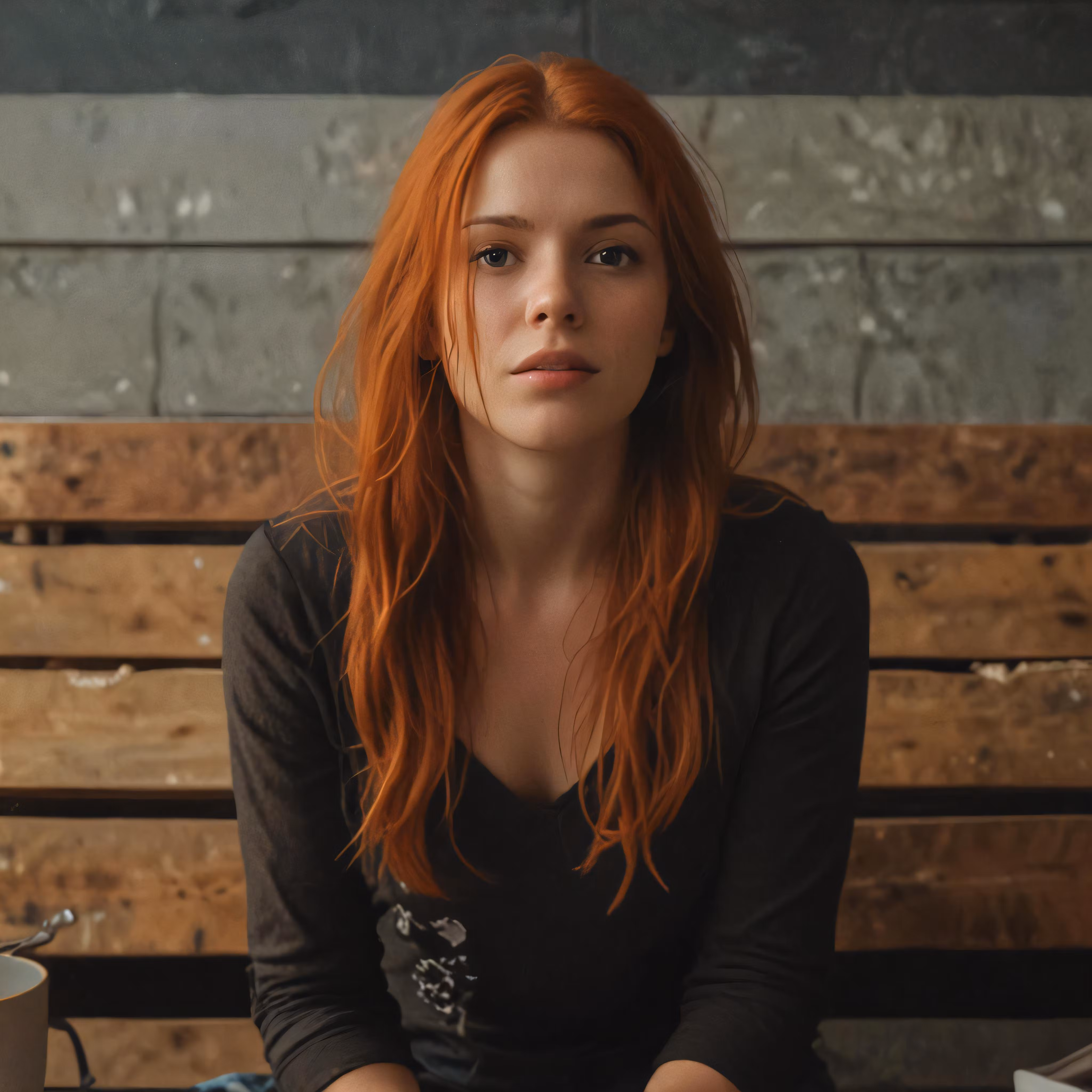 High resolution picture, free to use, a girl with bright orange hair sitting by some wood