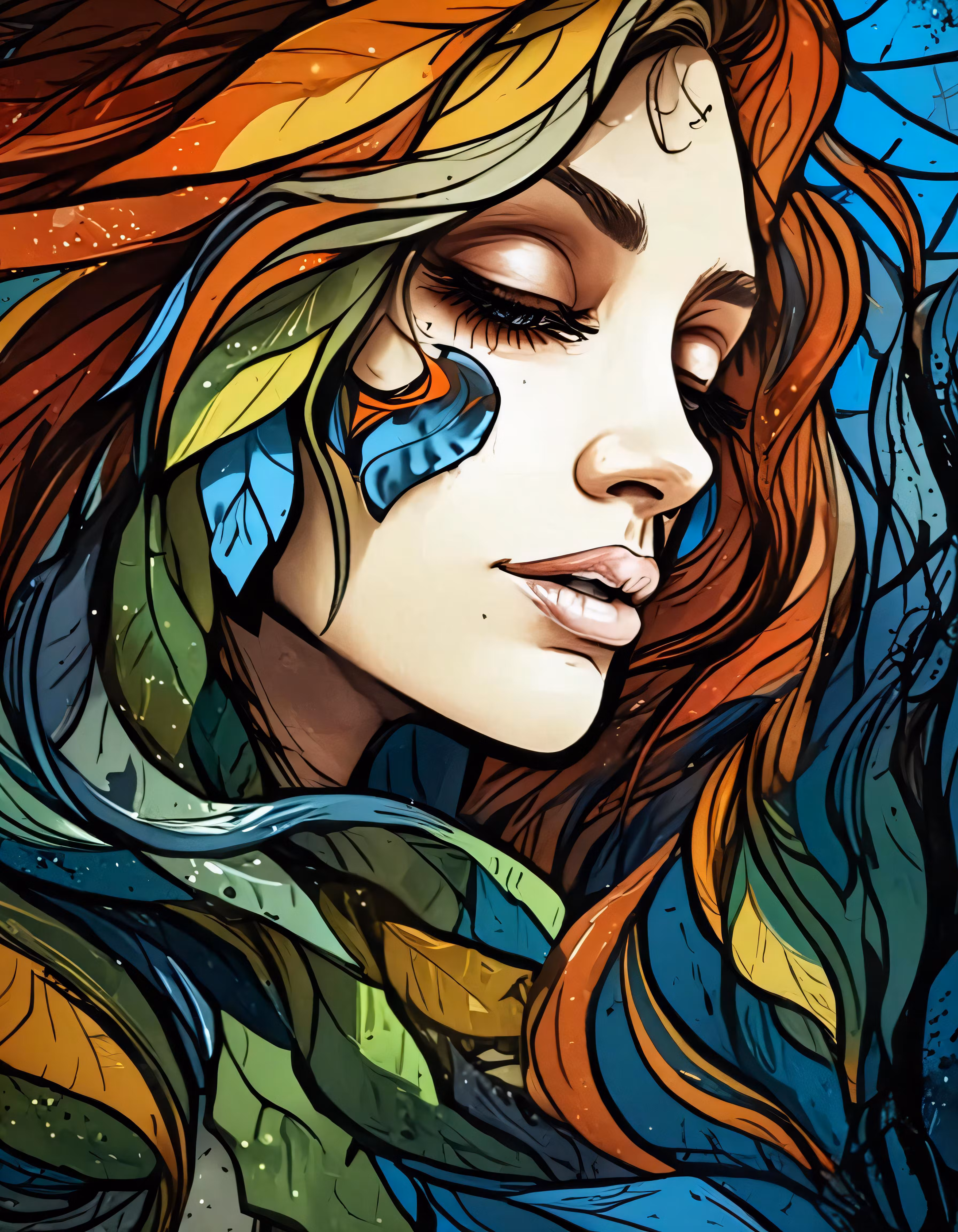 High resolution picture, free to use, a girl with her eyes closed in blue and orange