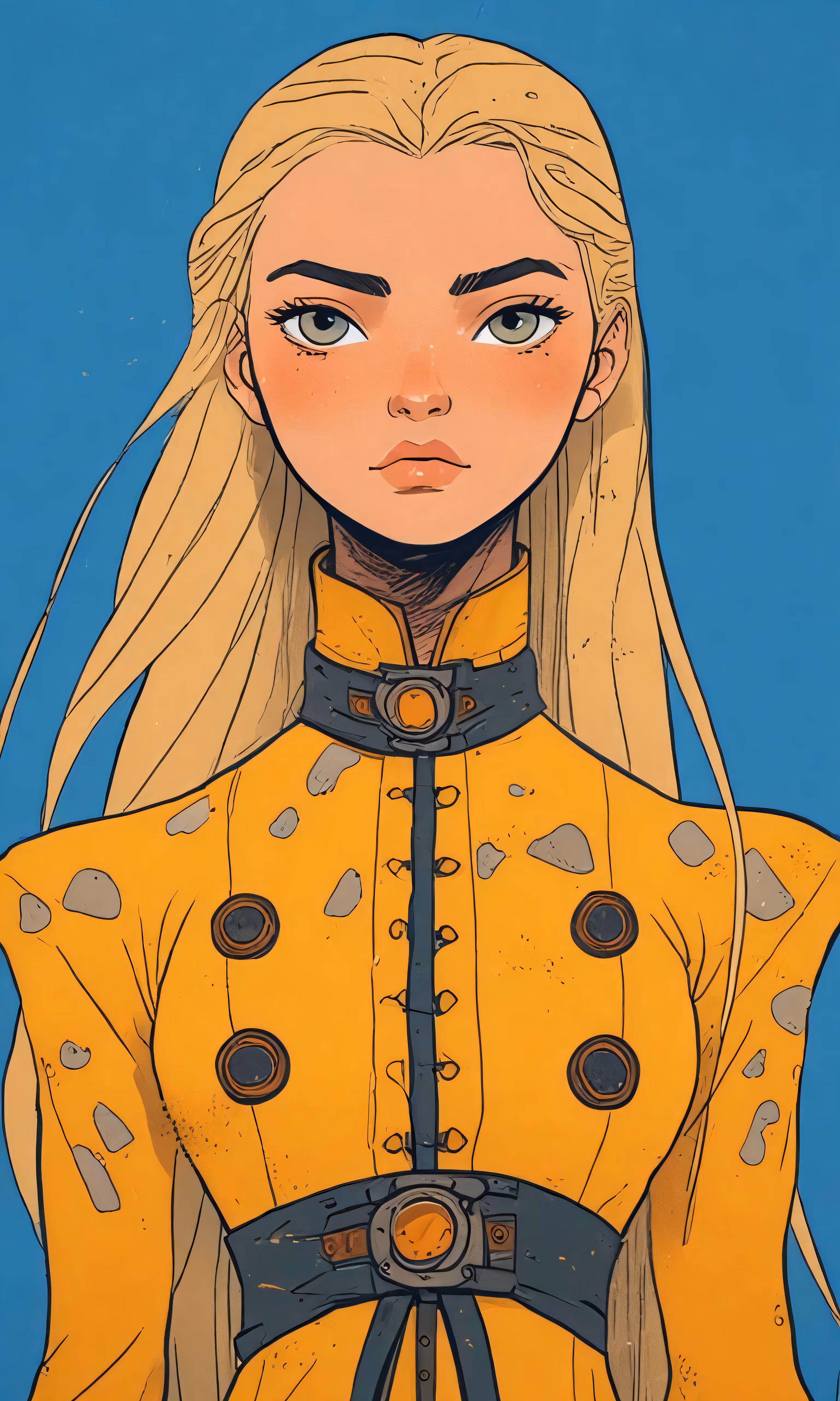 High resolution picture, free to use, a girl with long blond hair and blue eyes is wearing yellow clothes