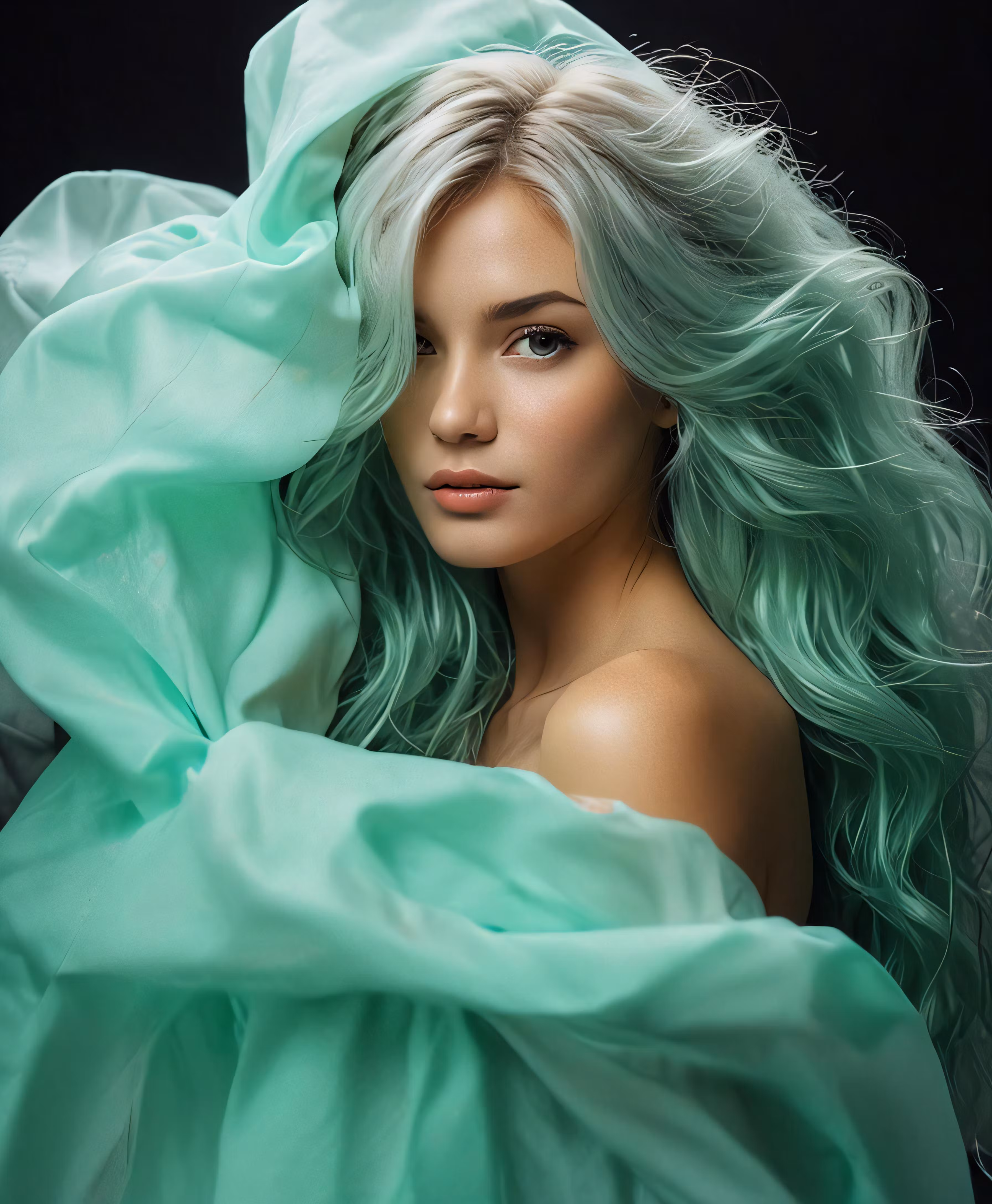 High resolution picture, free to use, a girl with long green hair and wearing a gown