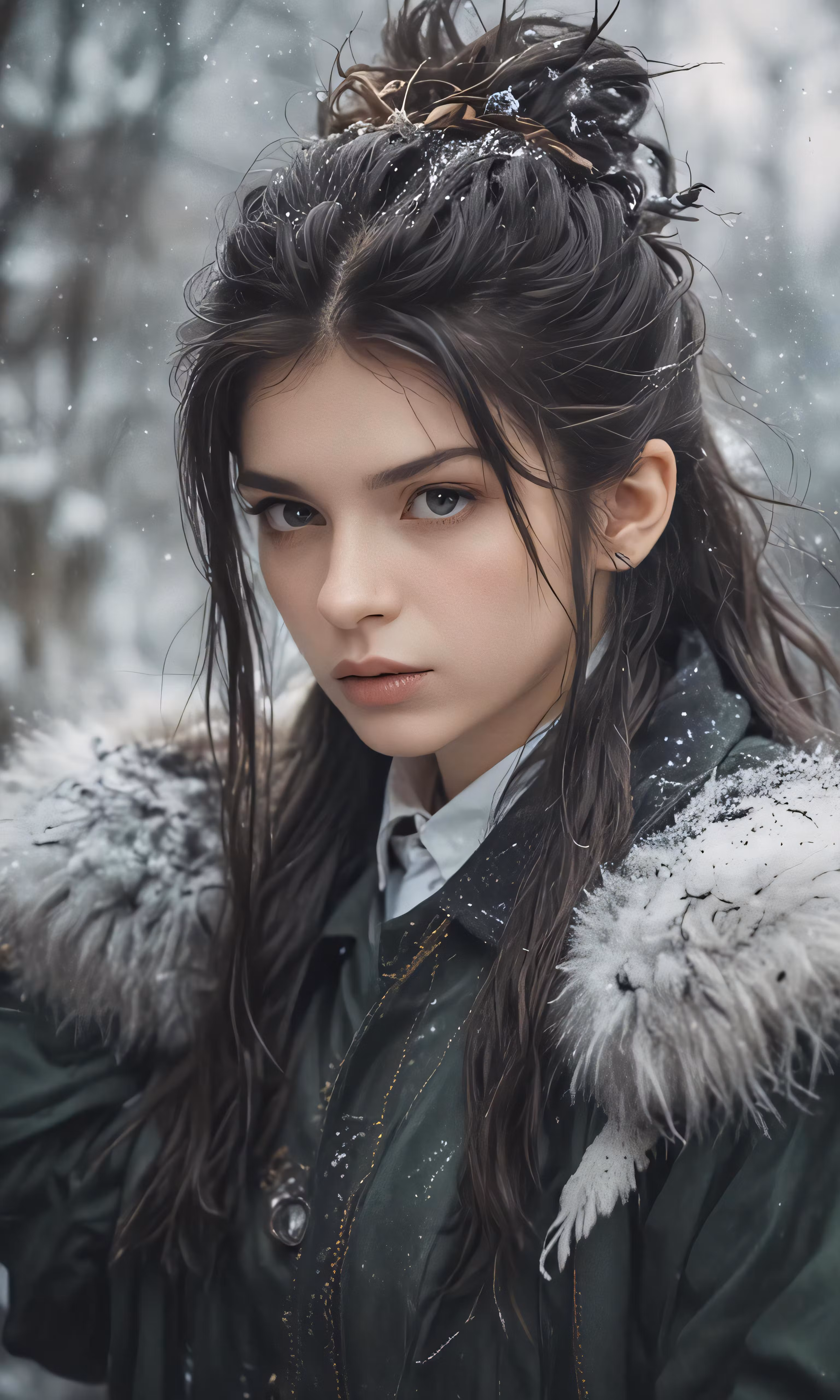 High resolution picture, free to use, a girl with long hair wearing a coat and fur collar, and standing in the snow