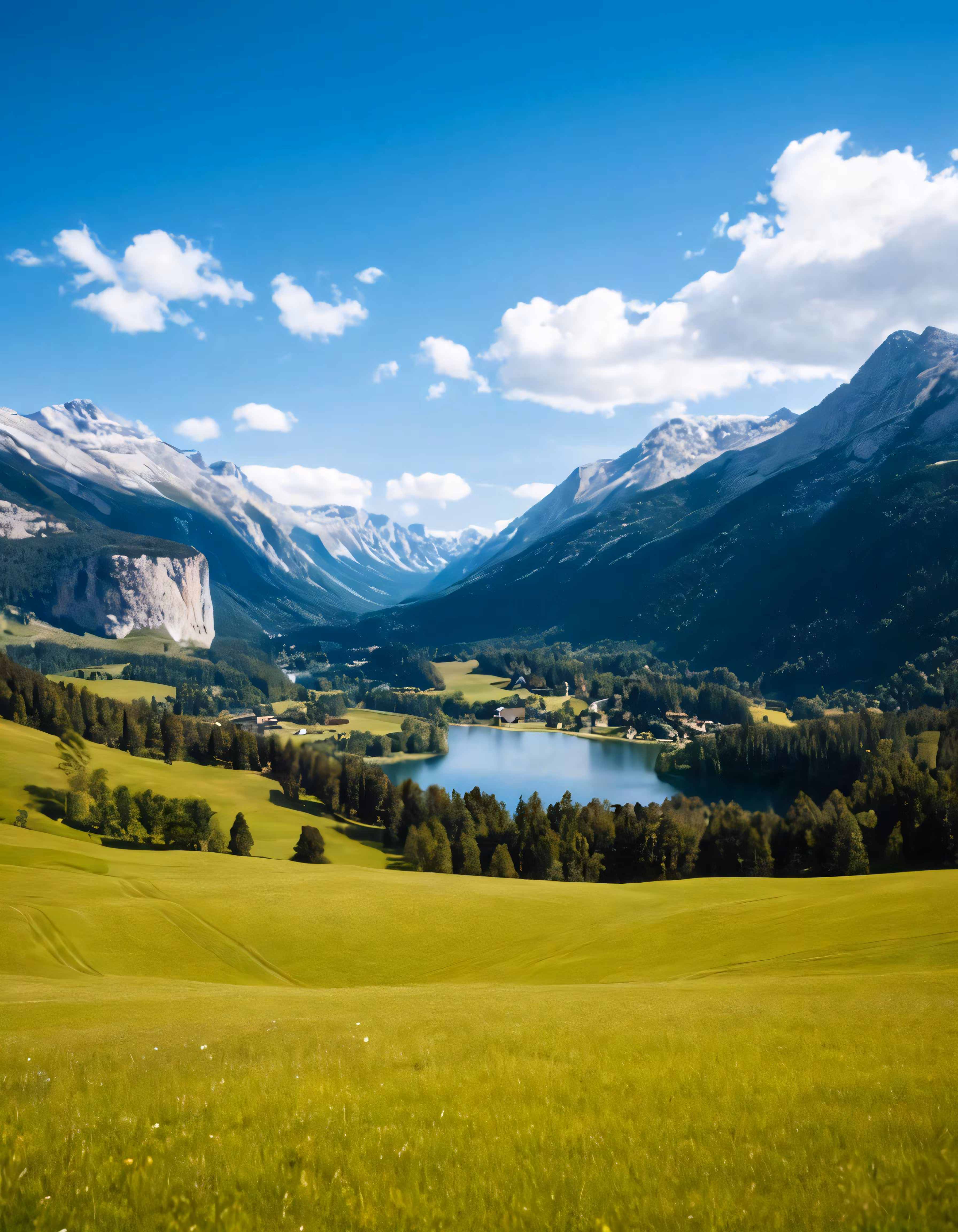 High resolution picture, free to use, a green valley that has water surrounded by mountains