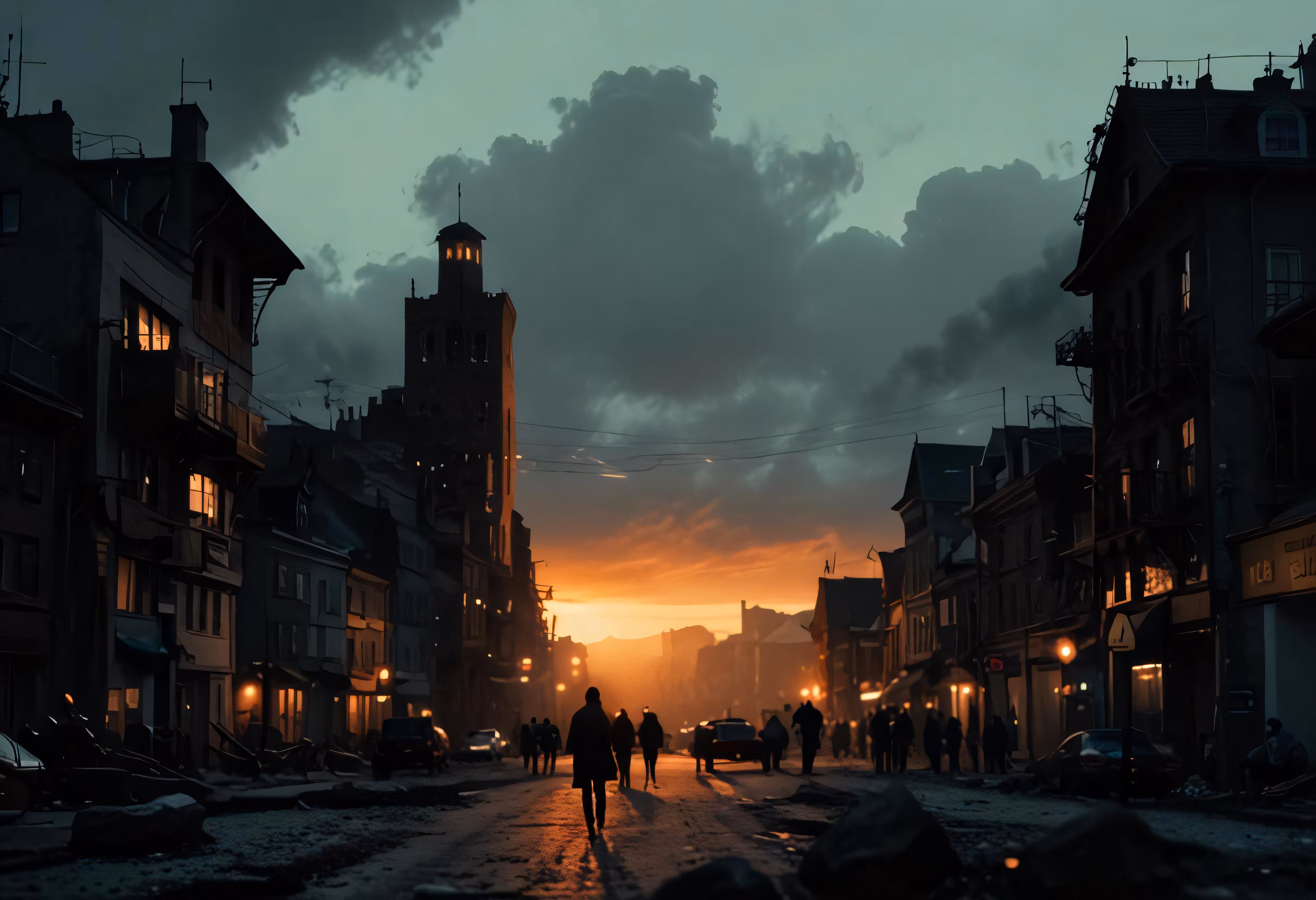 High resolution picture, free to use, a group of people are walking down the sidewalk as the sun sets