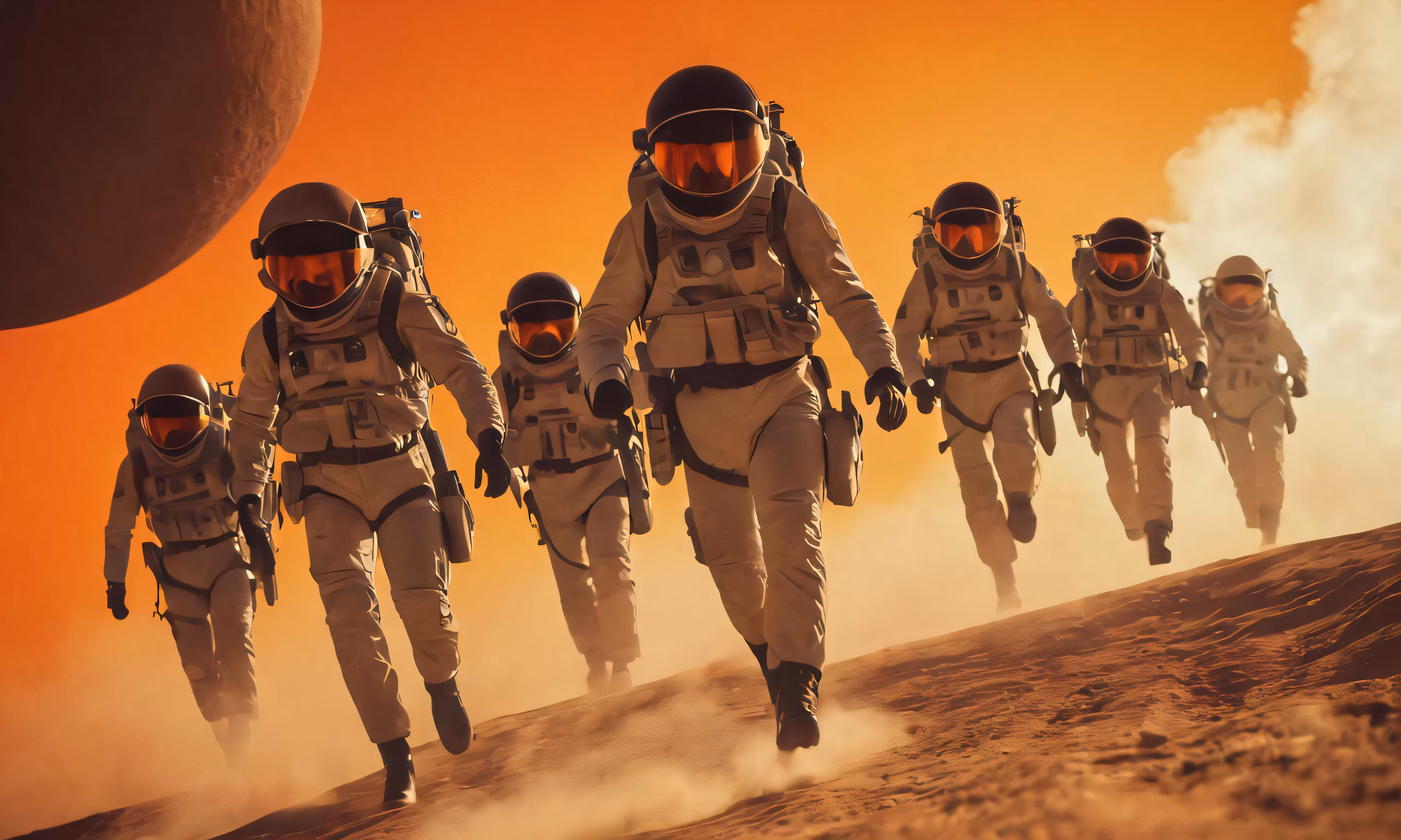 High resolution picture, free to use, a group of people in spacesuits are on the ground